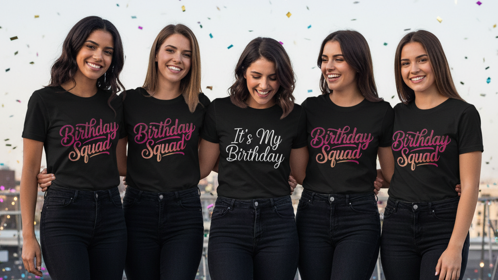 These shirts are perfect for group photos, nightlife events, themed parties, and destination trips. With fast turnaround, free shipping, and no minimums, it is simple to create birthday squad shirts for any size group.