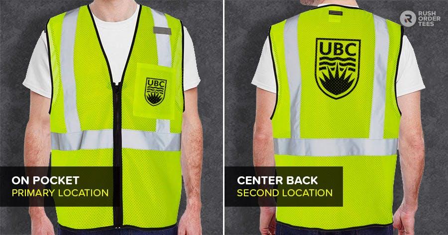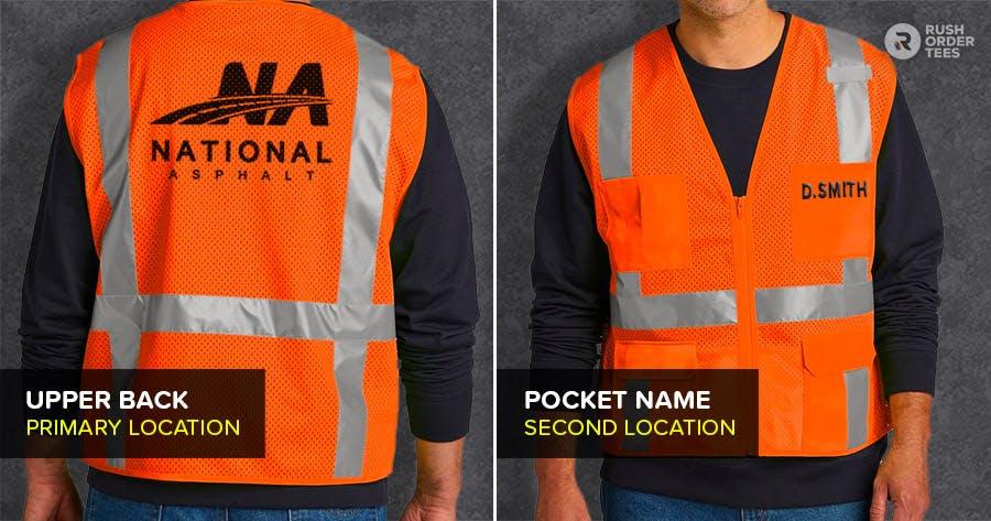 Safety vests come in a variety of styles and safety classes. Each kind is designed differently, with advantages and limitations regarding print size and location, so be strategic when designing your customization. Below are examples of the six top logo placement options and secondary locations.