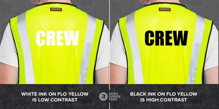 Most safety vests are printed with a single color, usually black for safety colors (yellow, orange, or green). Some vests are black or dark blue, and in those cases, use white ink. The idea is to achieve the highest contrast possible for visibility. Reflective vinyl is also an option.