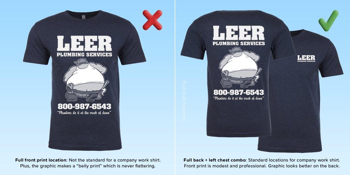 Example order: print on the right locations. The Leer Plumbing company shirt design would have be a standard full front, and although that’s a typical location for a T-shirt, it’s not necessarily best for a work shirt. We would recommend the standard pairing of left chest and full back. Their design has too much information and details to go on the left chest, so it’s simplified it down to just the company name on the left chest, which is also a standard. Having the phone number included on the left chest would be redundant.