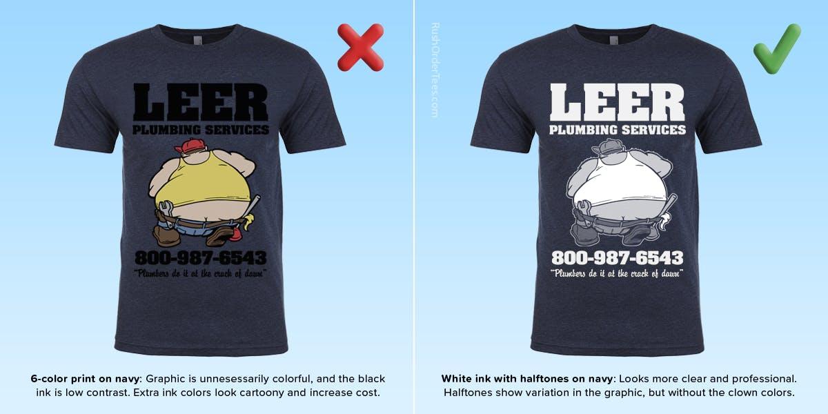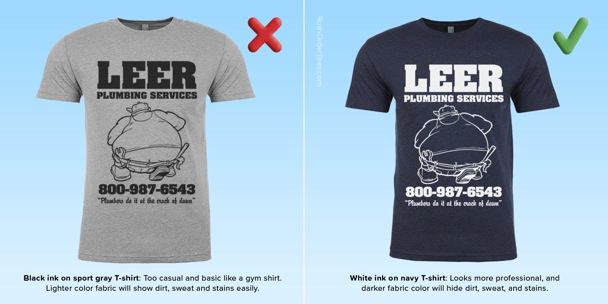 Example order: Picking the best shirt color for the jobFor Leer Plumbing, is heather gray the right choice for their employees? Plumbing is a dirty job, and on any day, a plumber can encounter all kinds of grease, grime, and things I don’t have to mention.Dirt or stains can be embarrassingly apparent on a lighter color shirt like gray, and especially white. No one wants to see that. Simple solution: Choose a dark shirt color. Let’s go with the classic and noble navy.