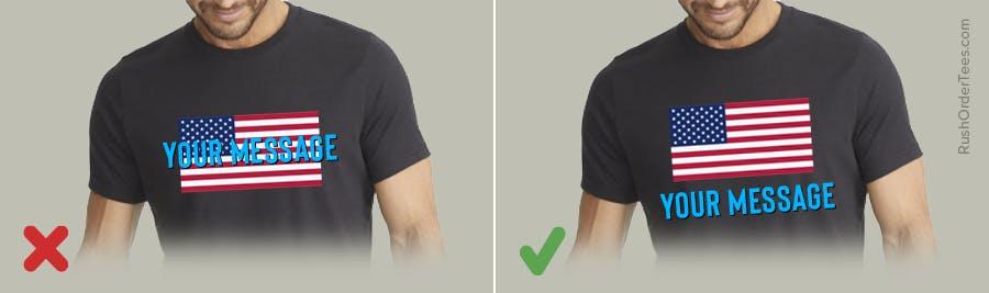 This is another one from the flag code we feel can be a good guideline for T-shirts most times. When you are using the American Flag in your design, place it on top of all other elements, including arched text. Putting it below other items signifies submission or a lower hierarchy. For true patriots, nothing should come before the flag.