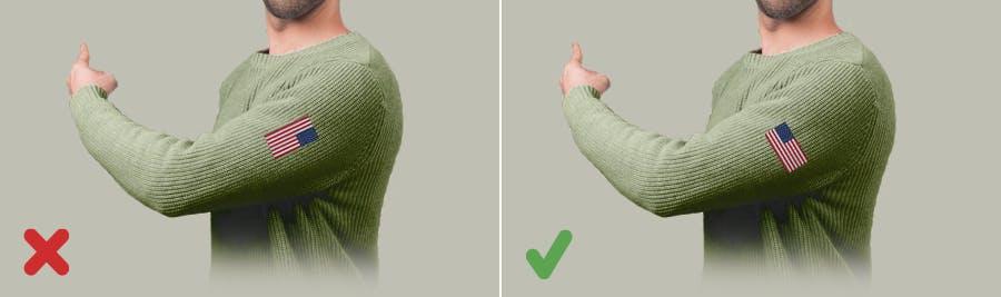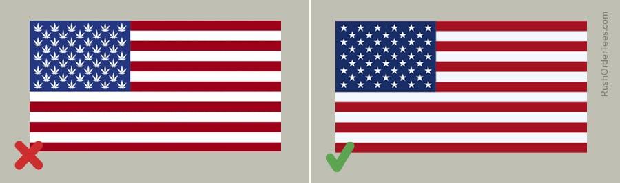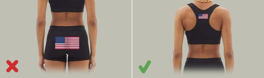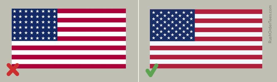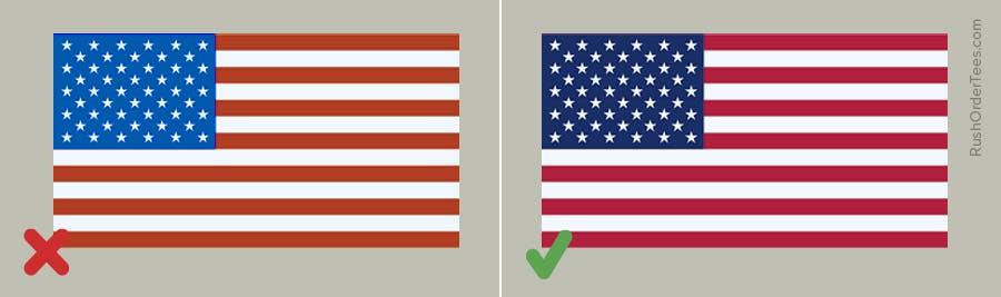 An upside-down flag signals distress, and it can also signify being anti-America. How would this happen accidentally? If you print the flag sideways on a sleeve, the flag will appear upside down when you raise your arm (to point, let’s say). Avoid this entirely by not printing the flag sideways on a sleeve.