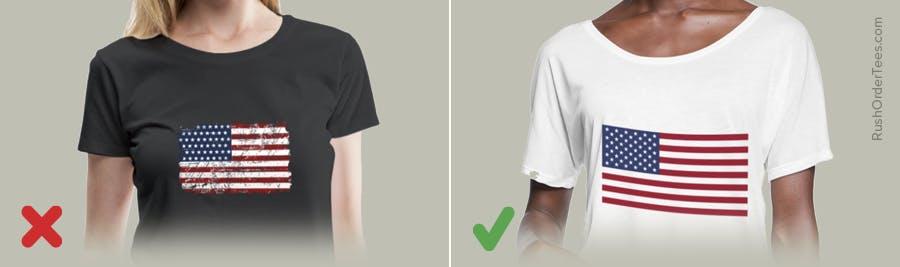 This is a common mistake that happens when you are printing a flag with a single color of ink (white, usually) on a darker shirt color (including red and navy). In these cases, invert single-color clip art flags so that they are negative–but will print positive. For the best results, add an outline. If you don’t know how to do this on your own, simply put in a request with your order and our art department is happy to do it for you for free.