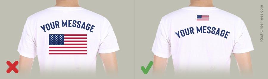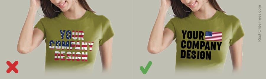 If your T-shirt design is featuring your logo or brand, or advertising anything, avoid incorporating the flag directly into your logo. It represents the country, not your company. Think about using elements such as stars and stripes instead, or keep them separate.