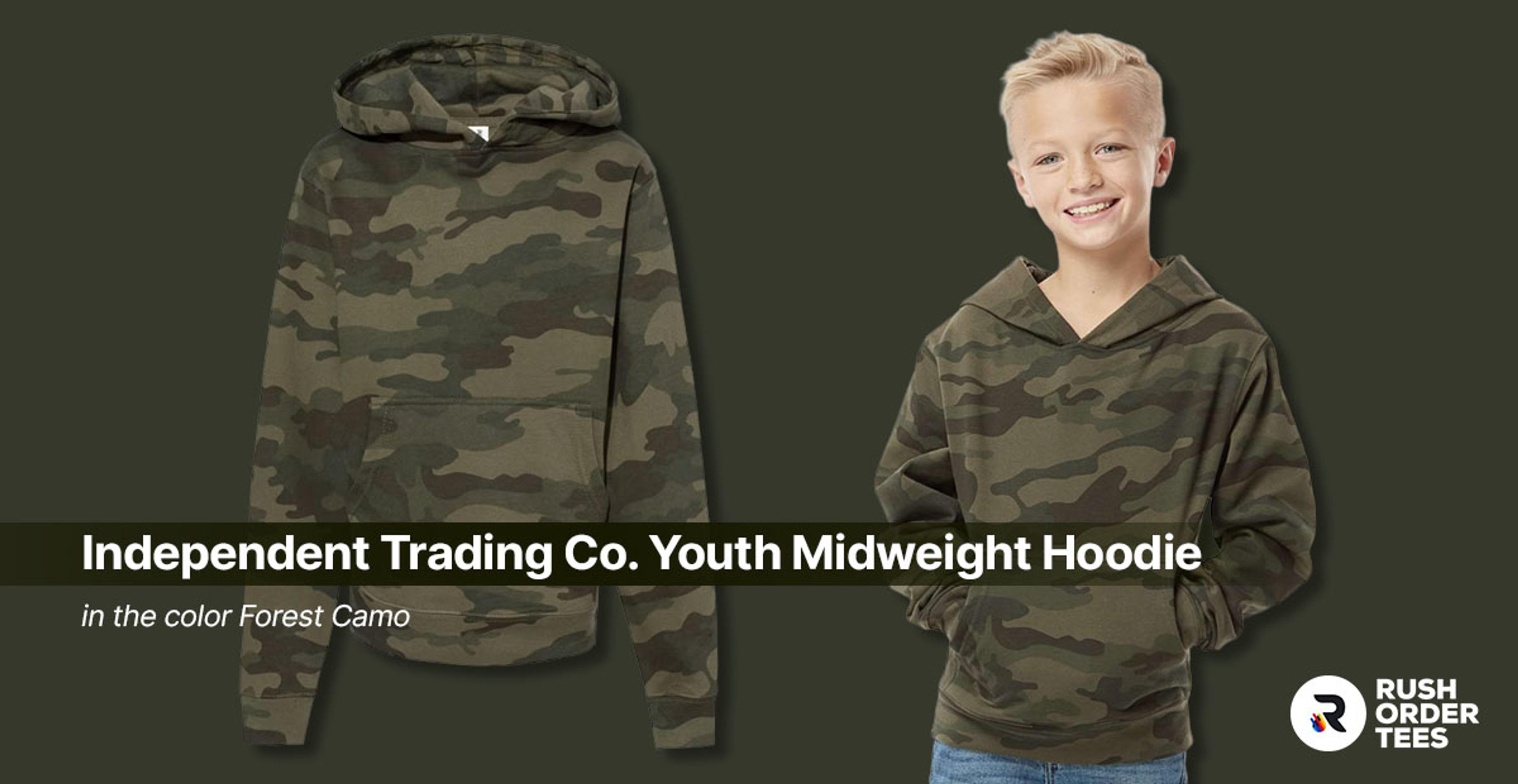 Constructed from 8.5-ounce fleece in an 80/20 ring-spun cotton-polyester blend with a smooth 100% cotton face, this hoodie delivers softness against the skin while maintaining durability through the polyester content. The jersey-lined hood adds comfort without extra bulk, and the classic military camo pattern in Forest Camo colorway gives it a traditional aesthetic that references streetwear's military-inspired roots. Design details like split stitch double-needle sewing and 1x1 ribbing at cuffs and waistband indicate quality construction, while the absence of a drawcord creates a cleaner, more modern silhouette. Despite being sized for youth, the styling and quality make it relevant for anyone who prefers a more fitted hoodie style or smaller frame.