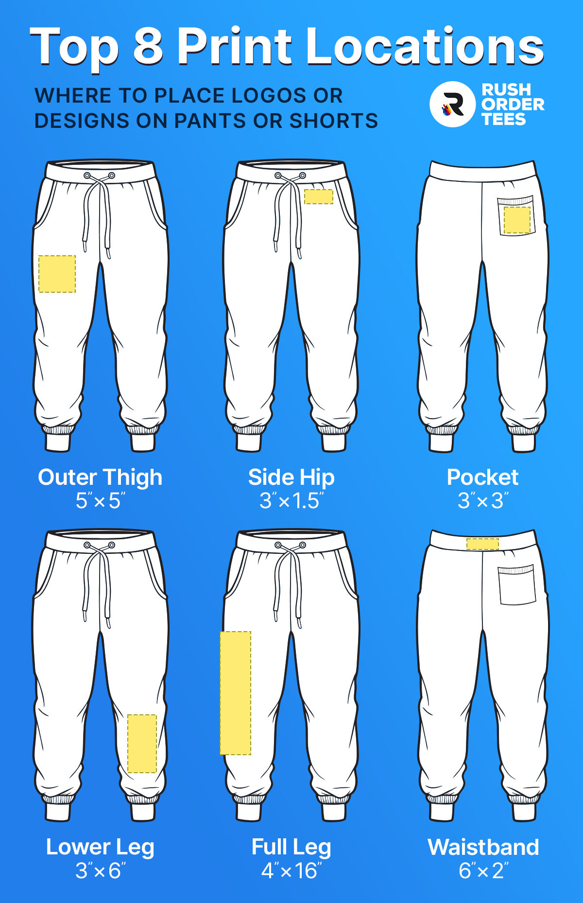 - Placement Ideas: Side hip area for maximum visibility, back pocket flap on cargo pants, outer thigh on structured joggers, or small logos on waistband areas. Keep designs under 4 inches wide to maintain comfort and garment drape.
