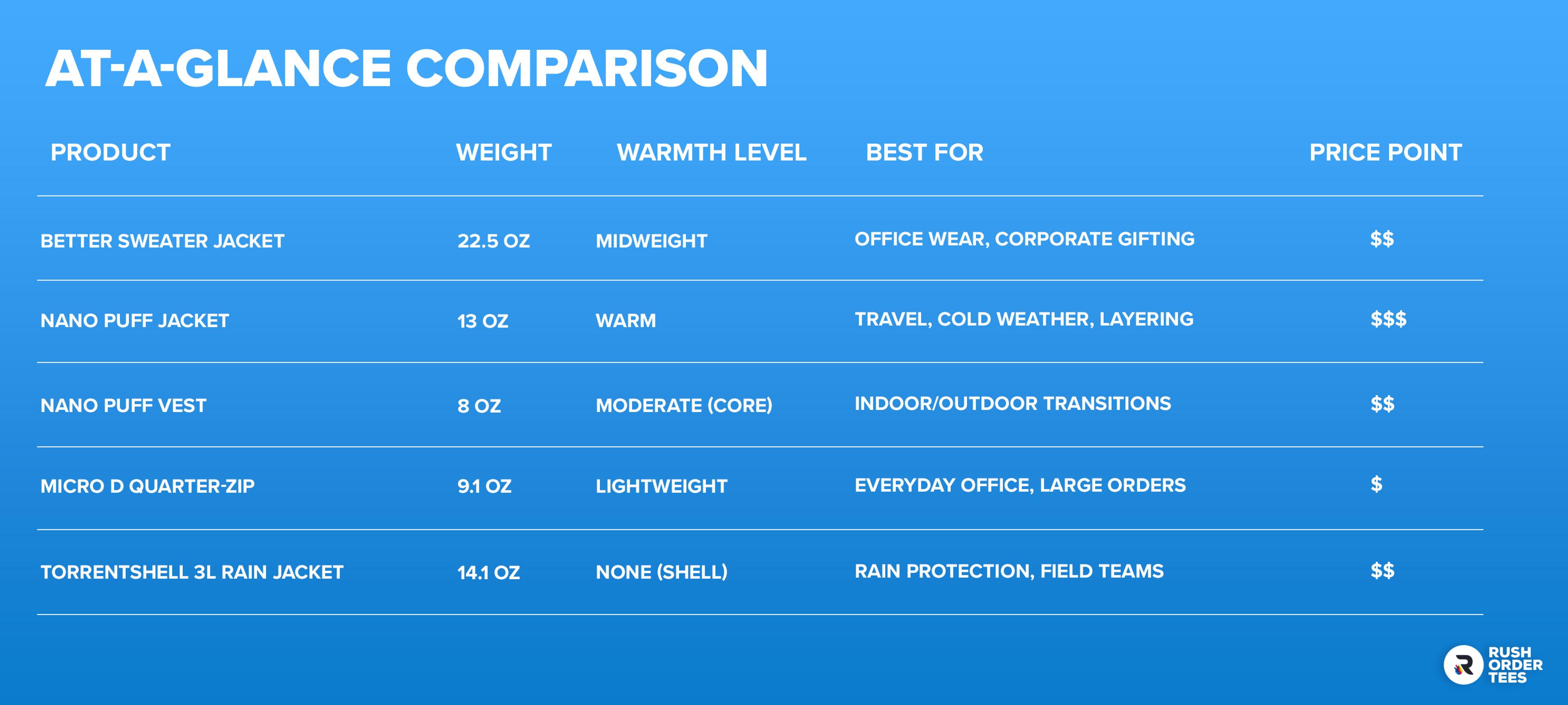 - Budget: Patagonia pricing varies significantly across product categories. A lightweight quarter-zip fleece costs considerably less than an insulated jacket, so factor in your per-piece budget when deciding what's realistic for your order size.