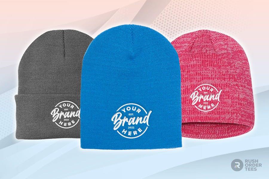 Embroidery is the way to go for beanies. We don’t recommend screen printing, and it can’t be done in most cases. An embroidered logo on a knit cap is durable and always looks legit.