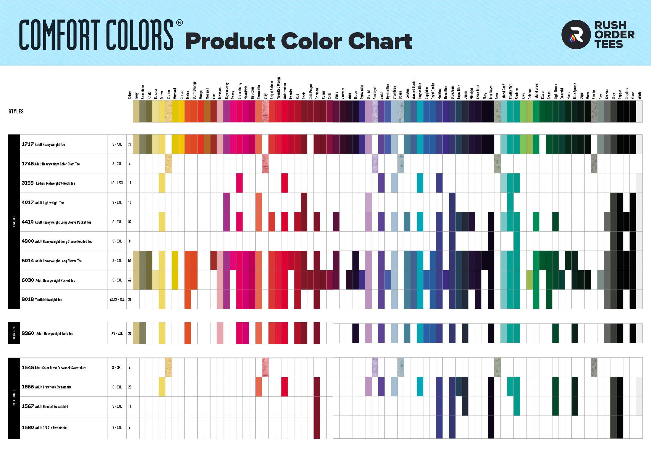 This chart shows exactly which colors are available for each of the various Comfort Colors products.