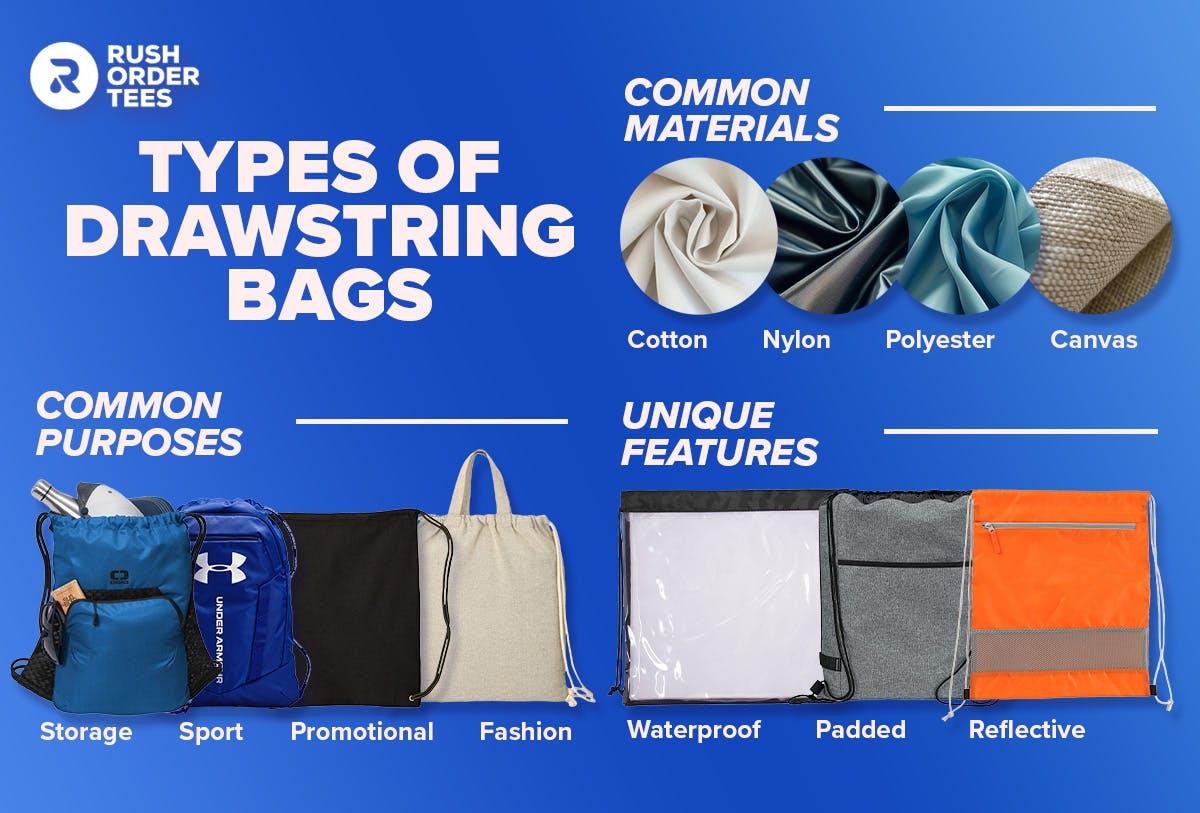 There are a few different ways that you can classify types of drawstring bags - material, purpose or features.
