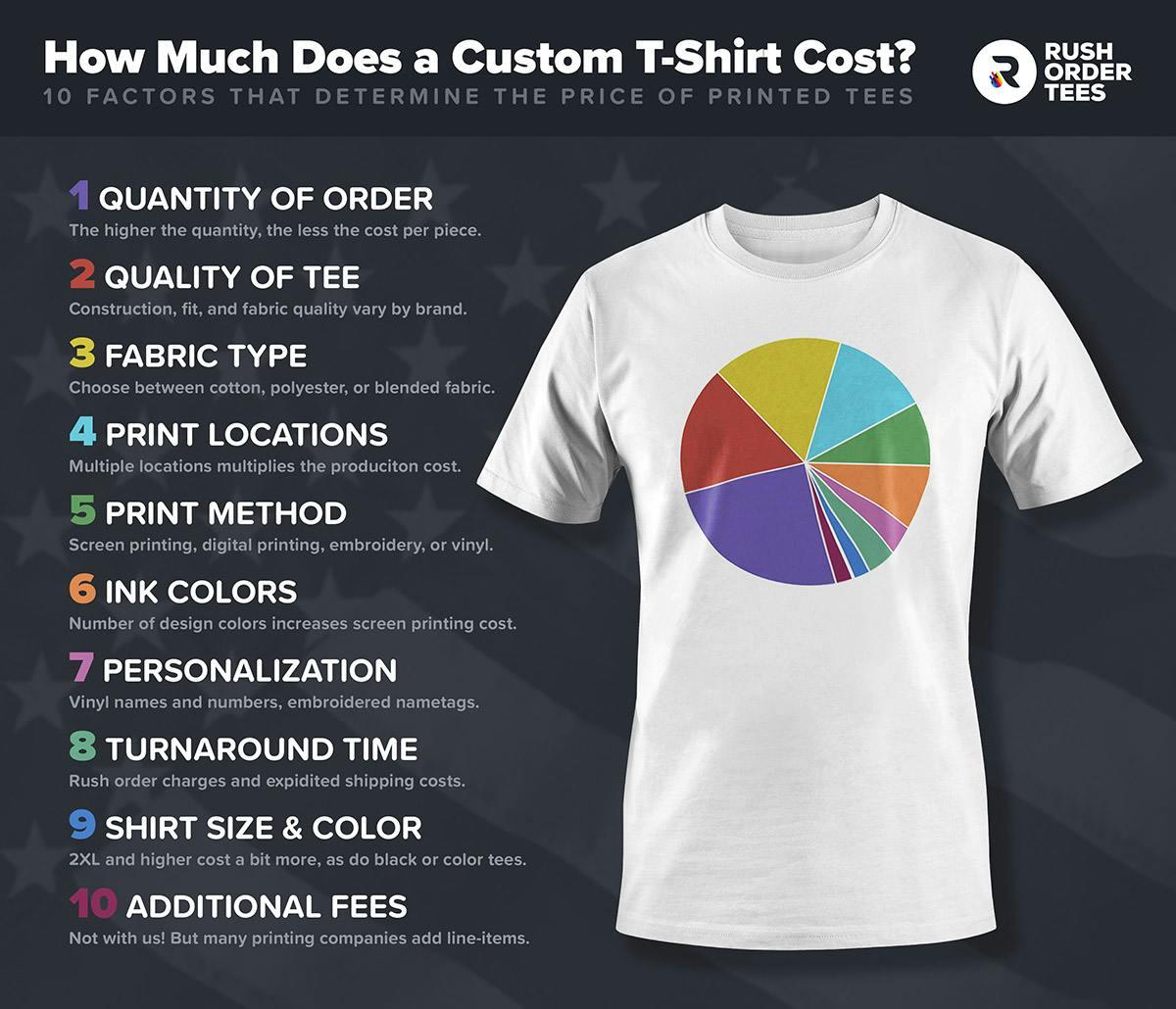 Several key variables affect the cost of making custom shirts. Although there are some variations in pricing models between competing printing companies, the vast majority of the major players in the industry factor the following variables into calculating the cost of custom t-shirts.