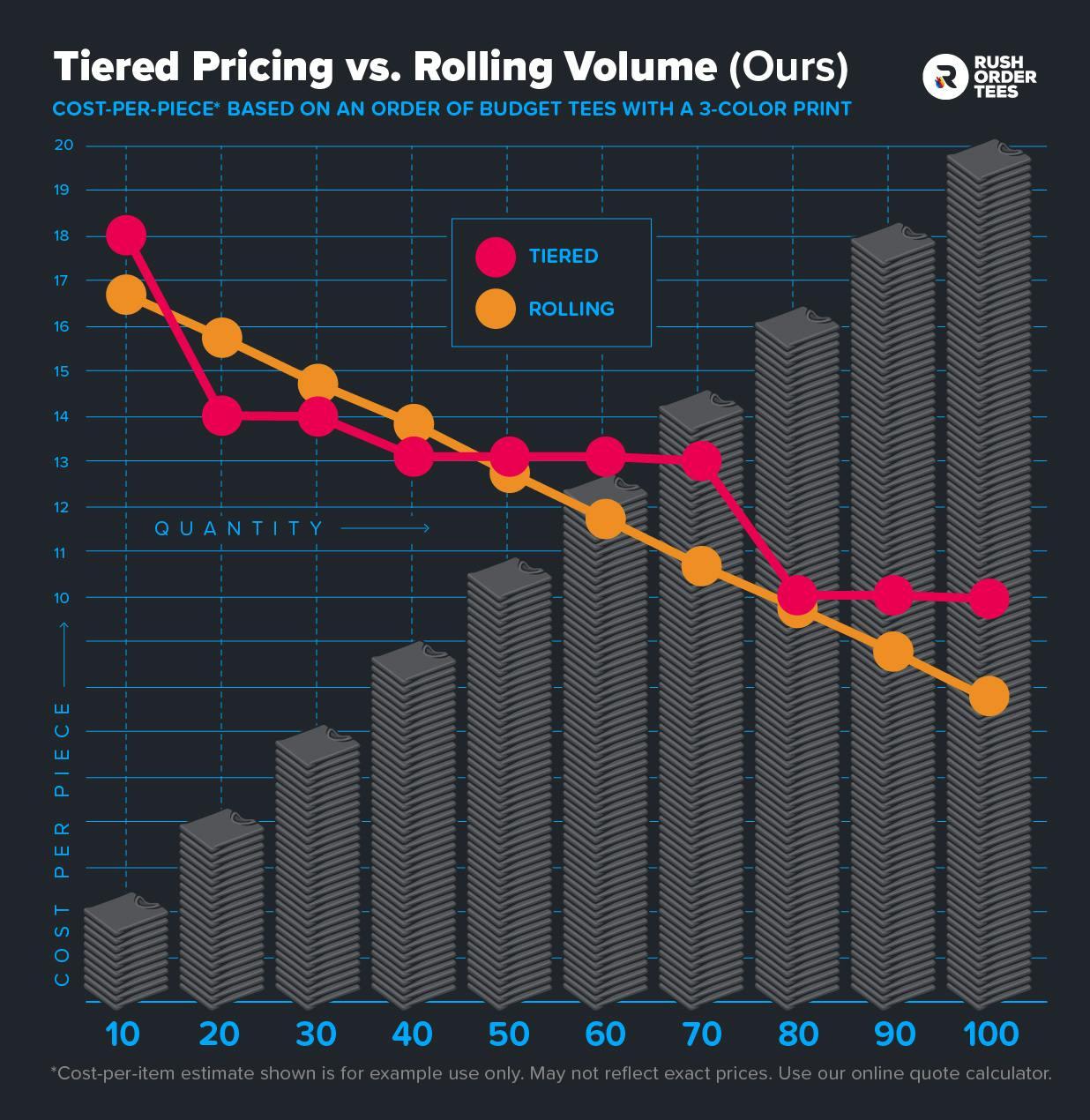 RushOrderTees, unlike competitors using the tiered pricing model, offers rolling volume pricing. Our discounts are incremental rather than tiered, so your cost-per-piece decreases with each additional item ordered. Use the quote calculator on each product page to price the exact quantity you need.
