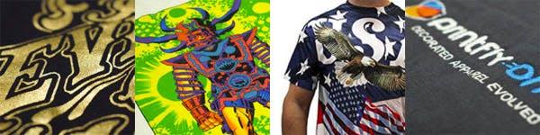 Heat transfer (or perma-press) is the method to use if you want some shiny metallic foil business or when you have a full-color design but can't afford to pay for all the ink colors. Keep in mind it creates a thin plastic coating on the surface of the fabric, eliminating breathability. So best not to make the design solid.