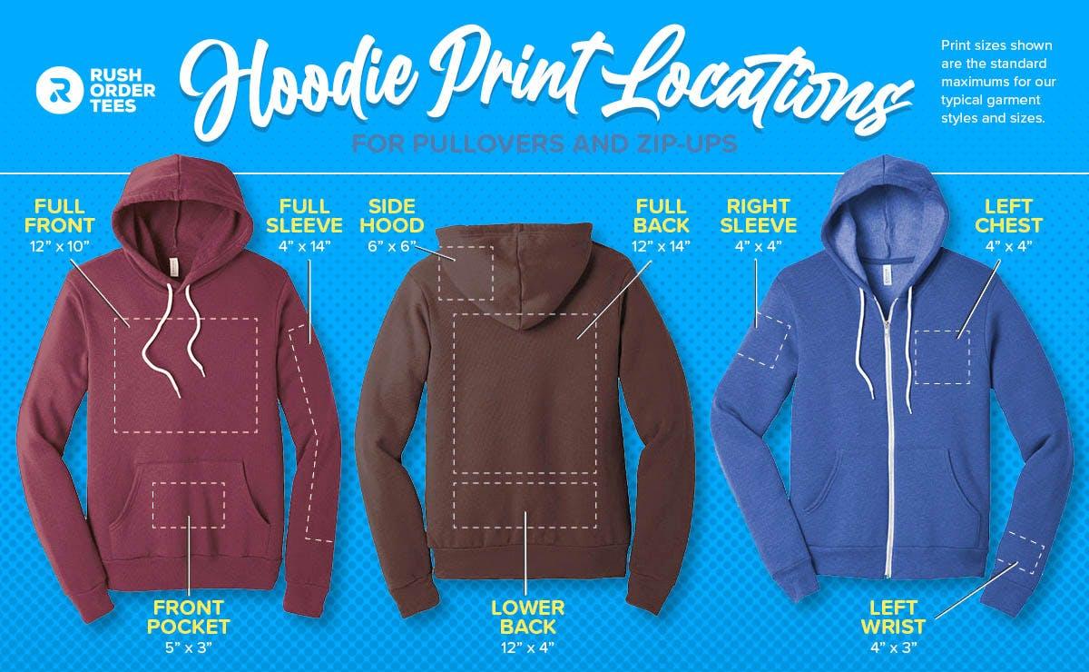This versatile garment has a variety of possible print locations and customizing methods, but it comes with some restrictions. For example, printing on the front of pullovers is limited by the front pocket (if it has one), and printing on the front of zip-ups is limited by the zipper.