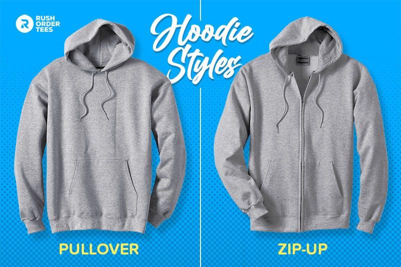 The two most popular styles of hoodies are pullovers and zip-ups. The major distinction between these two styles is how you put them on (hence the names). Zip-up hoodies have two front pockets, while pullover hoodies have one big front pocket. These two styles make up the vast majority of hoodies.