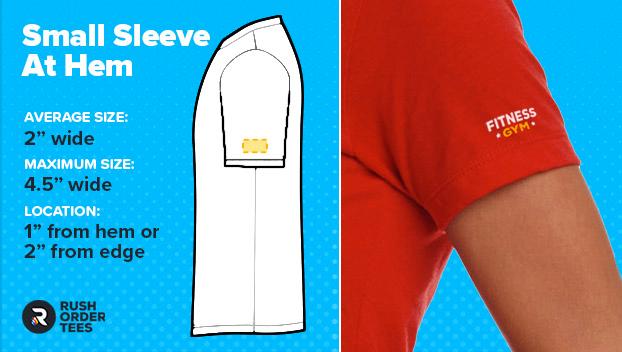 Smaller sleeve prints are also standard, measuring between 1-3" wide, placed 1" from the hem, and centered on the shoulder seam. This option is ideal for simple typographic logos or icons.
