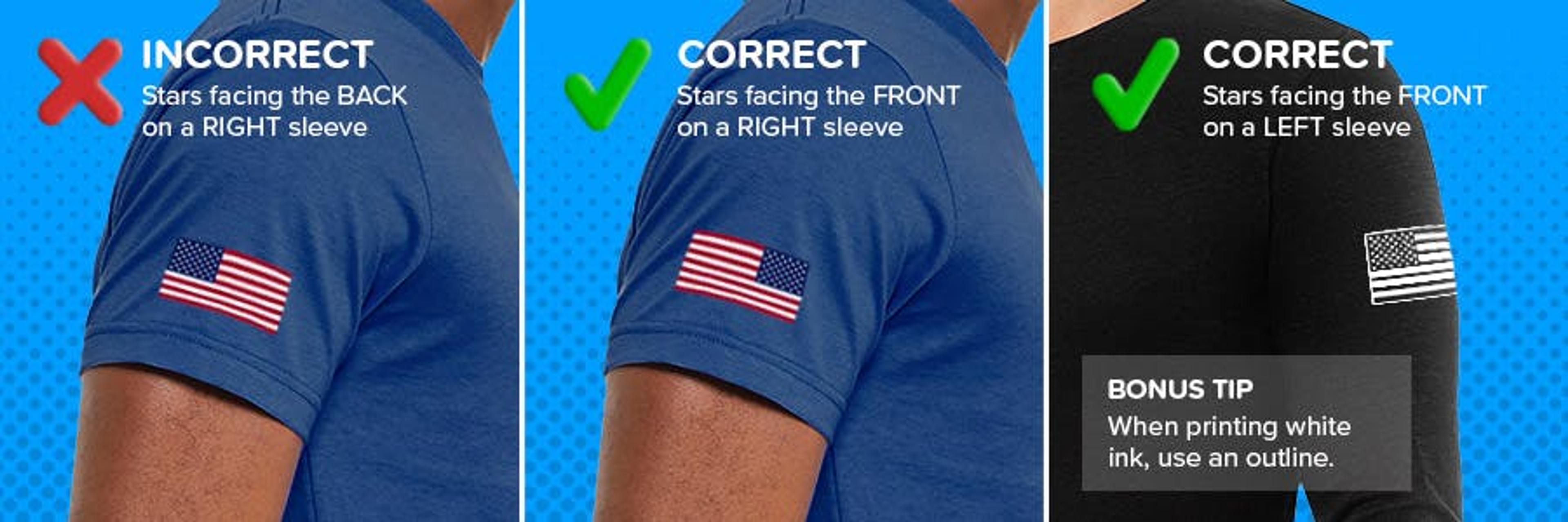 This one is a particular tip that we often get questions about. Yes, there is a standard for the direction of an American flag printed on a sleeve: The stars should be facing forward. So if it's a left sleeve print, the stars will be on the left and on a right sleeve, the right. Like this: