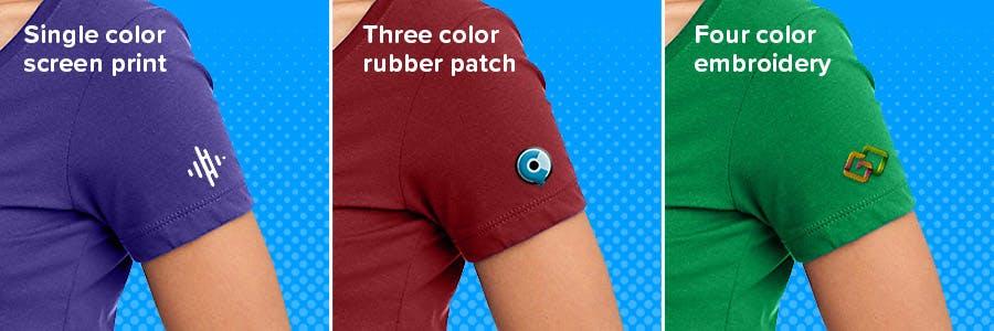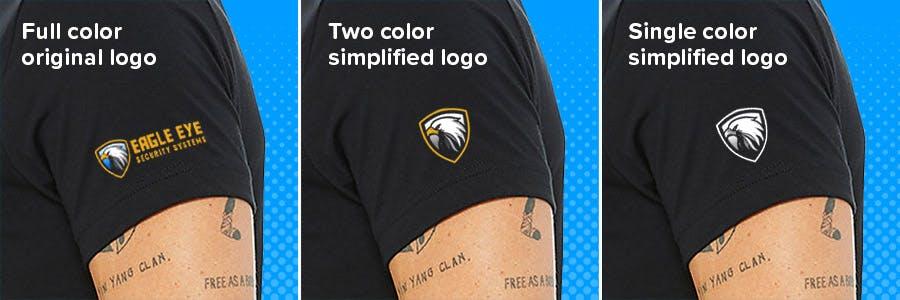 Most likely, you will have other print locations on your shirt, so the sleeve print must match or complement the rest of the shirt. If there's a predominant color in the front or back design, consider using that same color for your sleeve logo for a unified look, even if it's not your normal logo color.