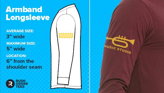 An armband is an alternative customization location not seen frequently. Running horizontally across the bicep, the armband shirt sleeve designs are sized 1-3" high with a maximum width of 5" and positioned 6" below the shoulder seam.