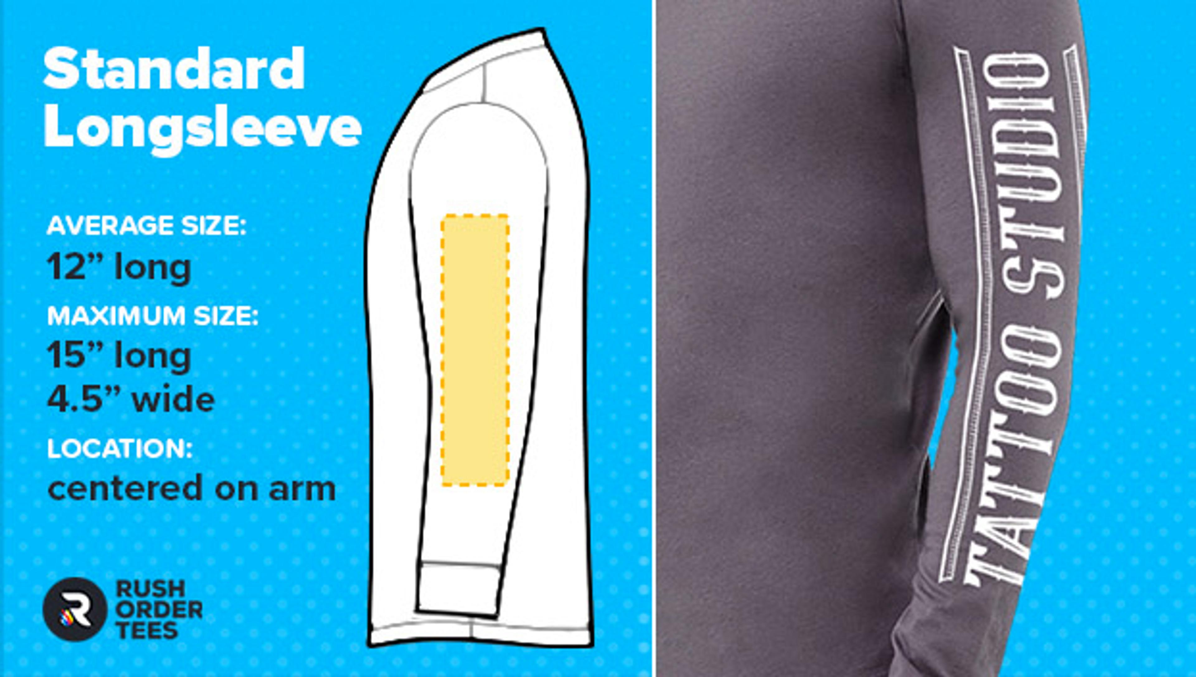 Long-sleeve prints typically run vertically, with a maximum size of around 15" wide (top to bottom) and a maximum height of 5" (side to side). These designs are often words: company name or team name, etc.