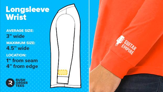 A long-sleeve wrist print is similar to the hem print on a short-sleeve tee. Sized between 1-3” with a placement of 1" from the wrist seam or 4” from the edge of the sleeve. An excellent eye-catching location for a logo, it's particularly effective for those whose hands are visible, like hospitality workers.