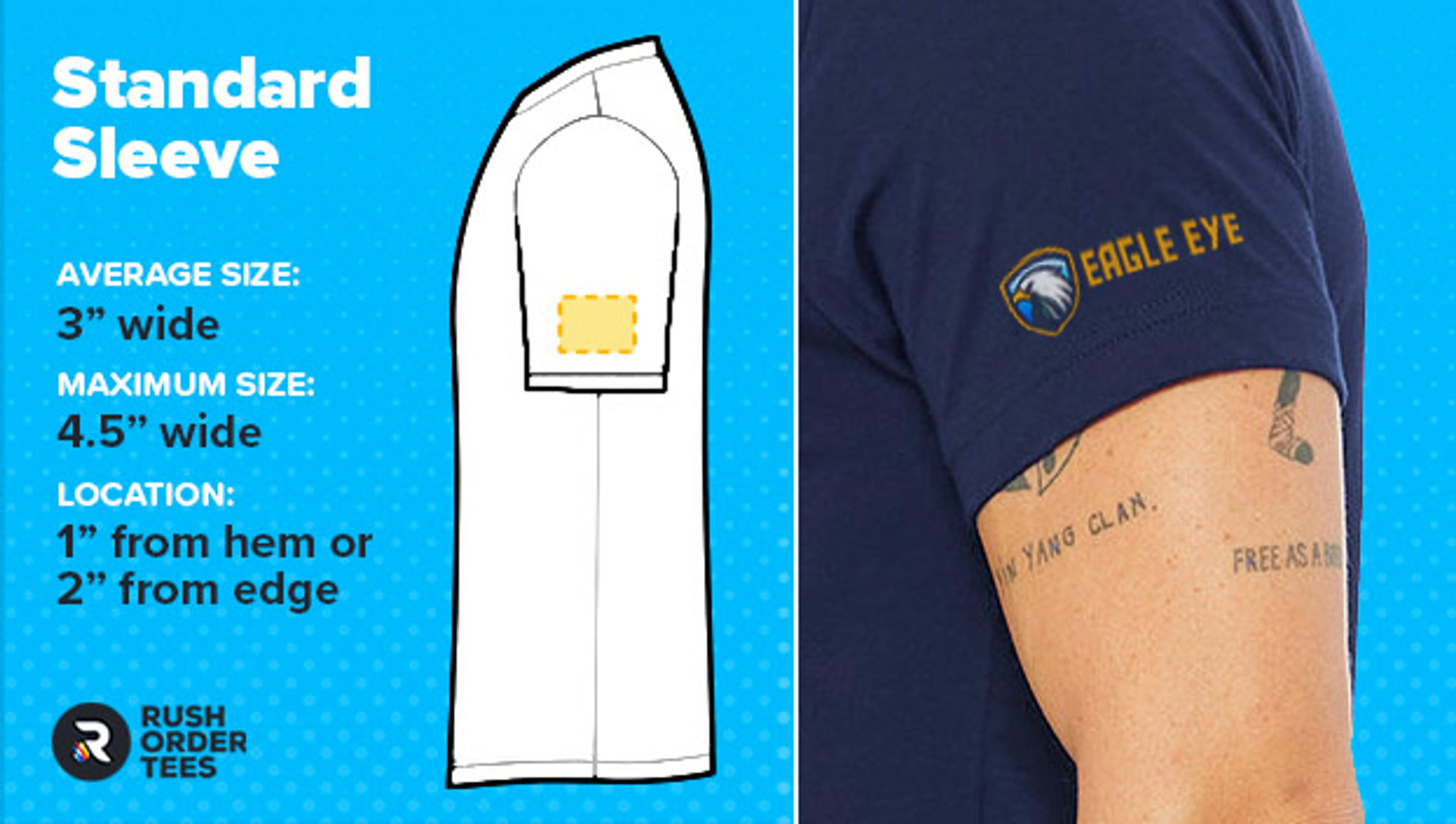 The standard sleeve print is between 2-4" wide, with placement at 1" from the hem, or 2" from the edge of the sleeve, centered on the shoulder seam. This size and location are versatile and work for just about any simplified logo design.