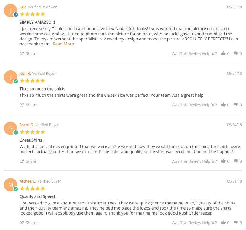 The number of years a company has been in business is an important factor to consider—it speaks to their quality and expertise. Most custom apparel companies are one-to-10 person shops–and every part of business in that range varies, from their speed, to their quality, service, processes, and systems. At RushOrderTees.com, we’ve worked very hard to maintain state-of-the-art equipment in every production method (DTG, screen printing, embroidery, vinyl) to make sure output quality is correct every time. This ensures that delivery times are never compromised and quality is always exceptional.