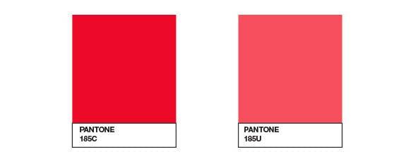 In the example above, the same ink (Red 185) looks a lot different printed on coated vs uncoated paper. So you’d want to pick a different C number and U number for them to visually match. Do you want fire-engine-red or salmon-red?