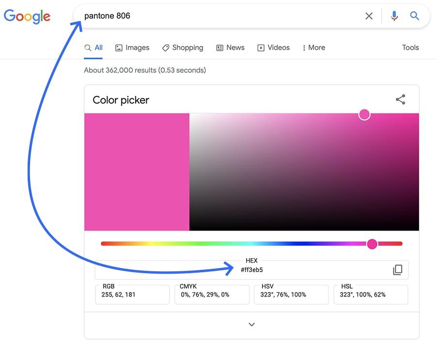 Converting Pantone to HEX code and vice versa has never been easier. Simply Google the Pantone number and the Google Color Picker will be the top search result, giving you the HEX code as well as RGB, HSB, and more. You can also use Pantone’s free online Color Finder.