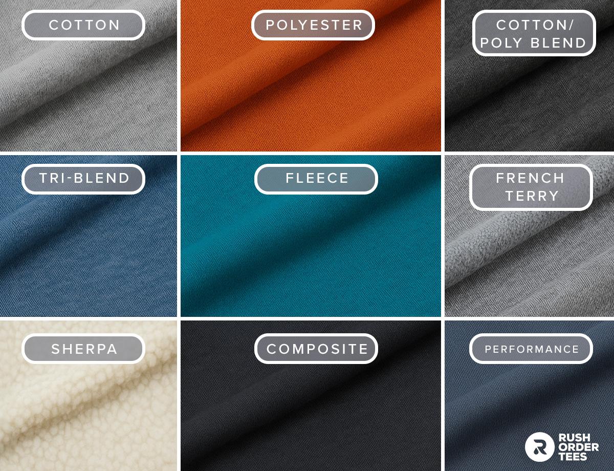 - Performance: Synthetic fabric engineered for athletic use with moisture-wicking properties and quick-dry technology. Usually polyester-based. See our selection of performance sweatshirts.