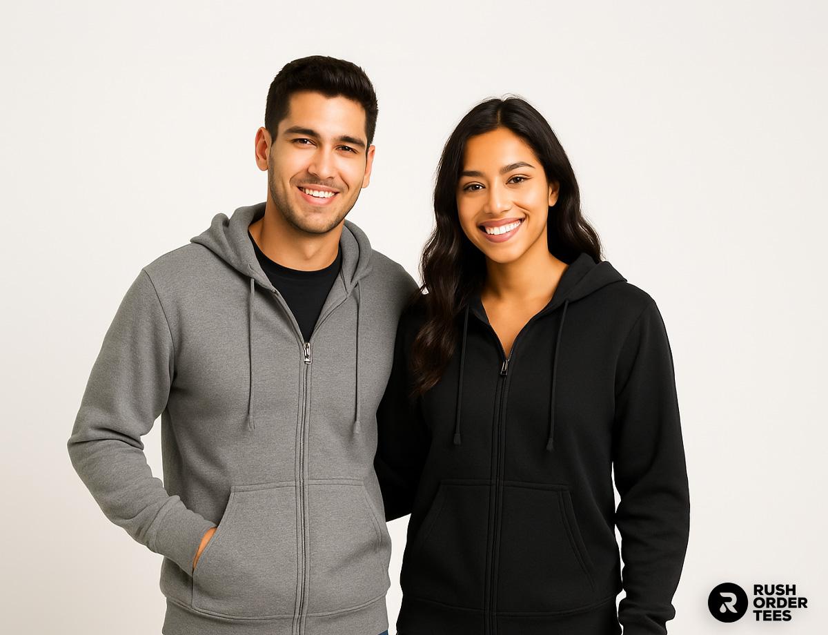Customization: Most decorators avoid the zipper divide and focus on left chest logos or full back designs. While printing across the zipper is possible with special techniques or design accommodations, it's usually simpler and more effective to work with the natural split front.