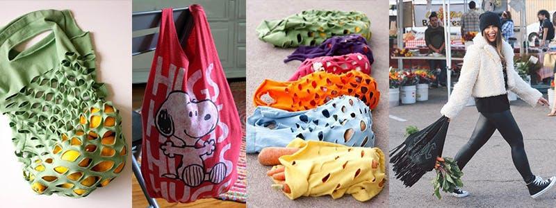 There are plenty of instructions online on how to create a tote bag from used clothing, but it can be as simple as cutting a tee to form two handles and then cutting the bottom into strips that you will tie together. Super cute.