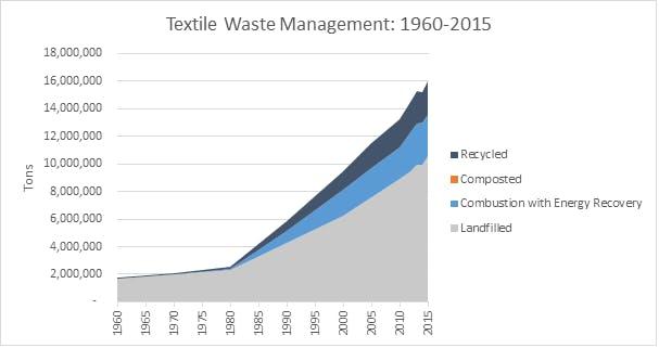 According to the EPA, in 1980, the U.S. generated around 5 billion pounds of textile waste, with 4 billion of that going into landfills. In 2015, just 35 years later, post-consumer textile waste was over 32 billion pounds, with 21 billion pounds of that going into landfills.