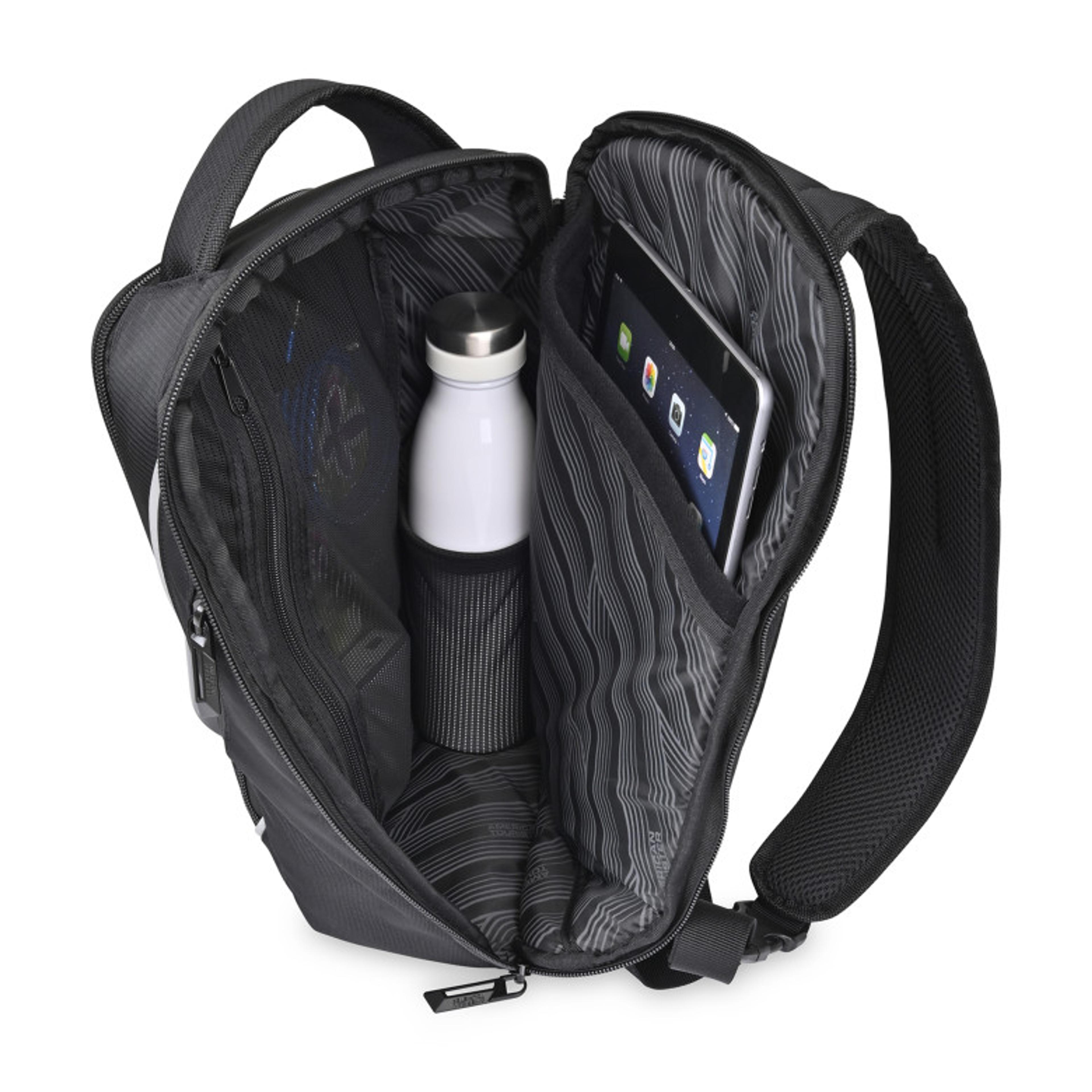 Designed for organization and comfort, this versatile bag features a large main compartment with a zippered mesh pocket and an interior bottle holder. A padded tablet sleeve with a soft tricot lining fits devices up to 10”, while the front zippered pocket includes both a slash and additional zip pocket for smaller essentials. The side zippered pocket keeps your phone secure, and the padded back panel conceals a hidden pocket for personal items. Complete with padded grab handles, an adjustable shoulder strap with buckle, and a PVC-free design, it’s made for convenience on the go.