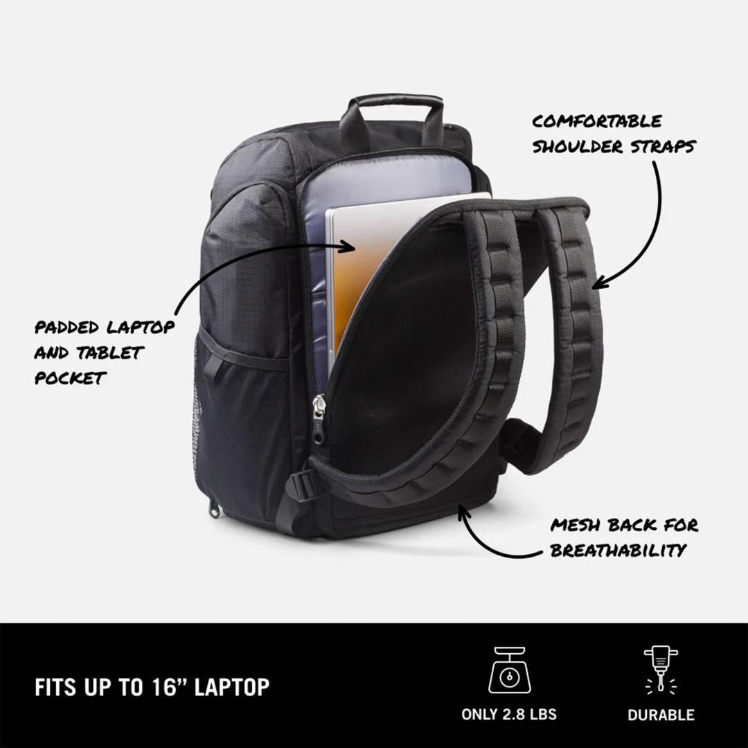 This innovative backpack is designed for ultimate organization and efficiency, featuring a drop-down front panel for on-desk use and easy access to essentials. Side panels offer privacy and structure, while the top quick-access pocket includes a key leash and compartments for earbuds, ID cards, and more. Built from lightweight ripstop nylon and PU-coated Cordura, it weighs just 2.8 lbs yet delivers reinforced durability to handle heavy loads. With padded laptop and tablet pockets for devices up to 16”, generously cushioned shoulder straps, a patented phone stand, and a removable drawer, this backpack combines comfort, style, and unmatched functionality.
