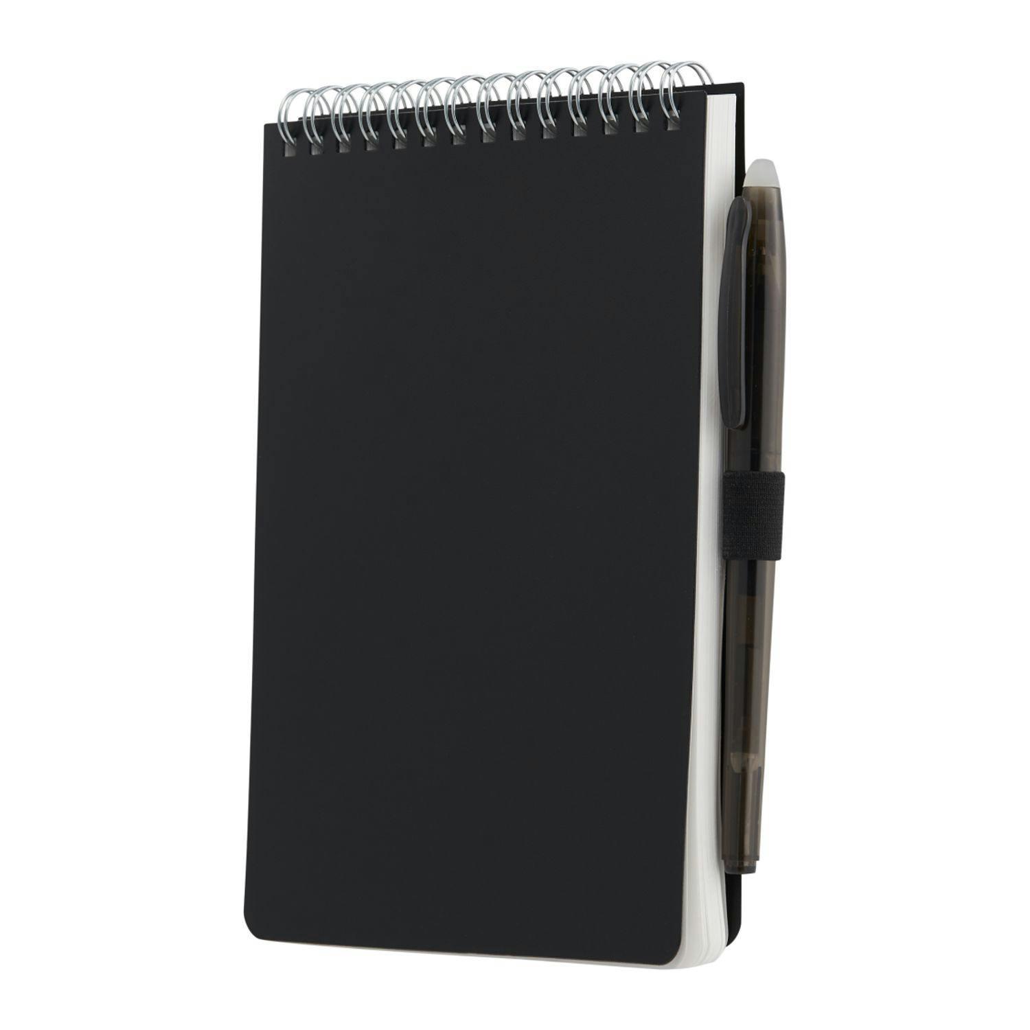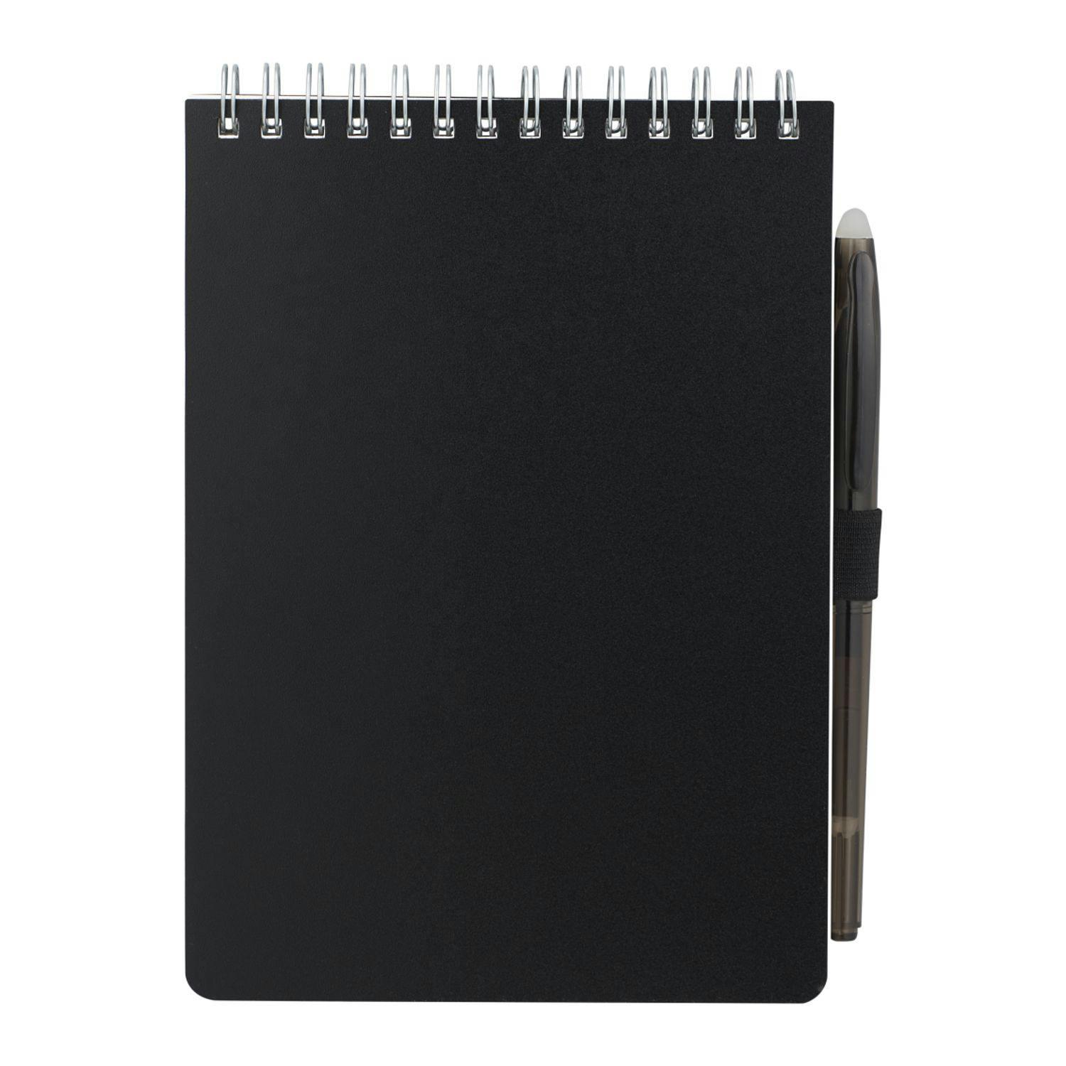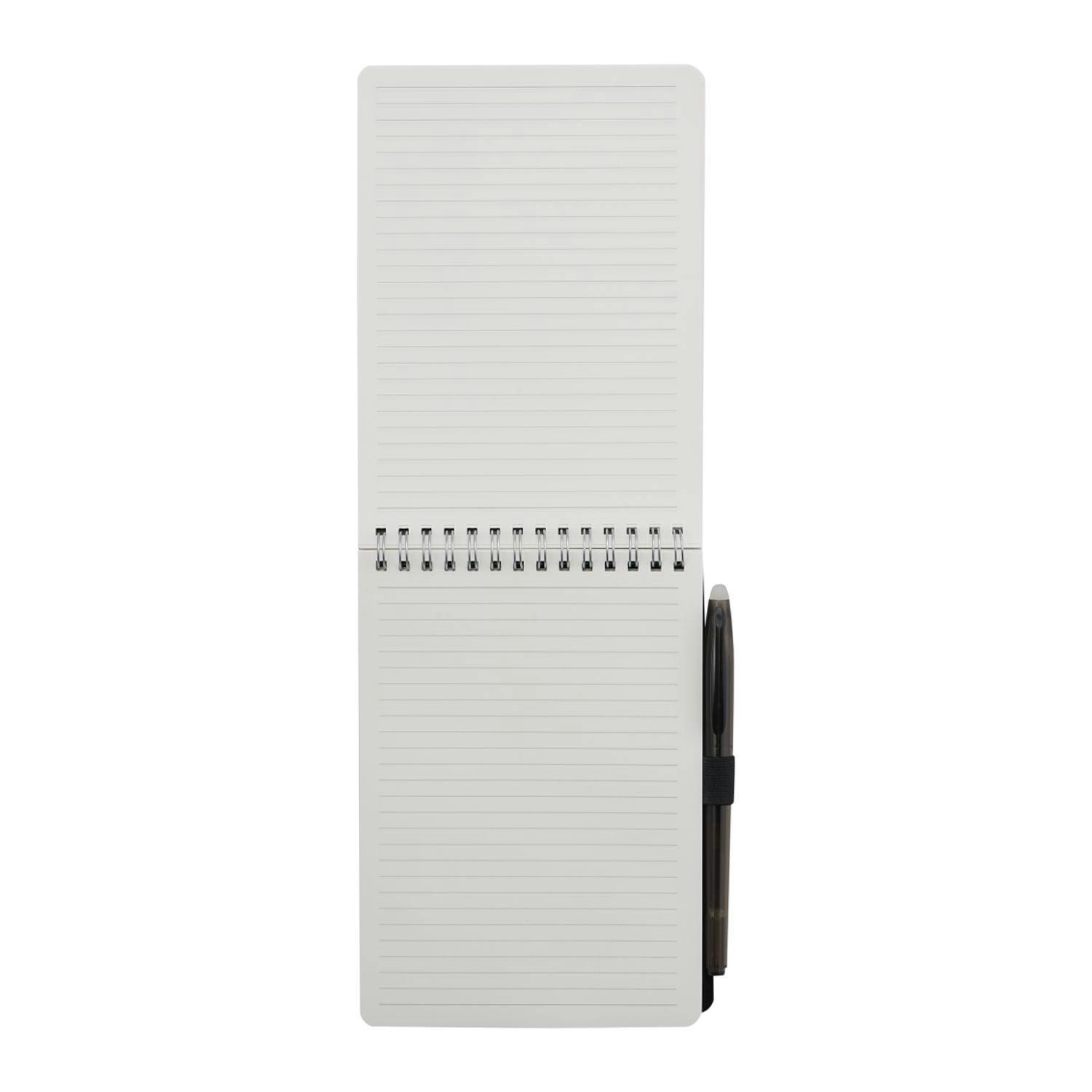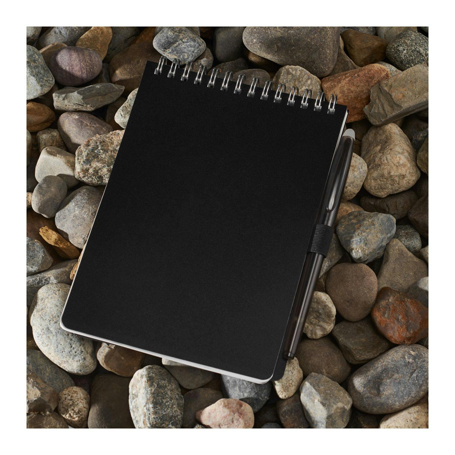 Take notes anywhere with this durable, eco-friendly field reporter notebook. Its recycled PP cover protects 64 lined pages of stone paper, offering a smooth writing experience that’s tear-resistant and water-resistant—perfect for outdoor use, job sites, or on-the-go journaling. The silver wire binding allows the notebook to lie flat, while the included RPET erasable pen fits neatly into the elastic pen loop, ensuring you're always ready to write.