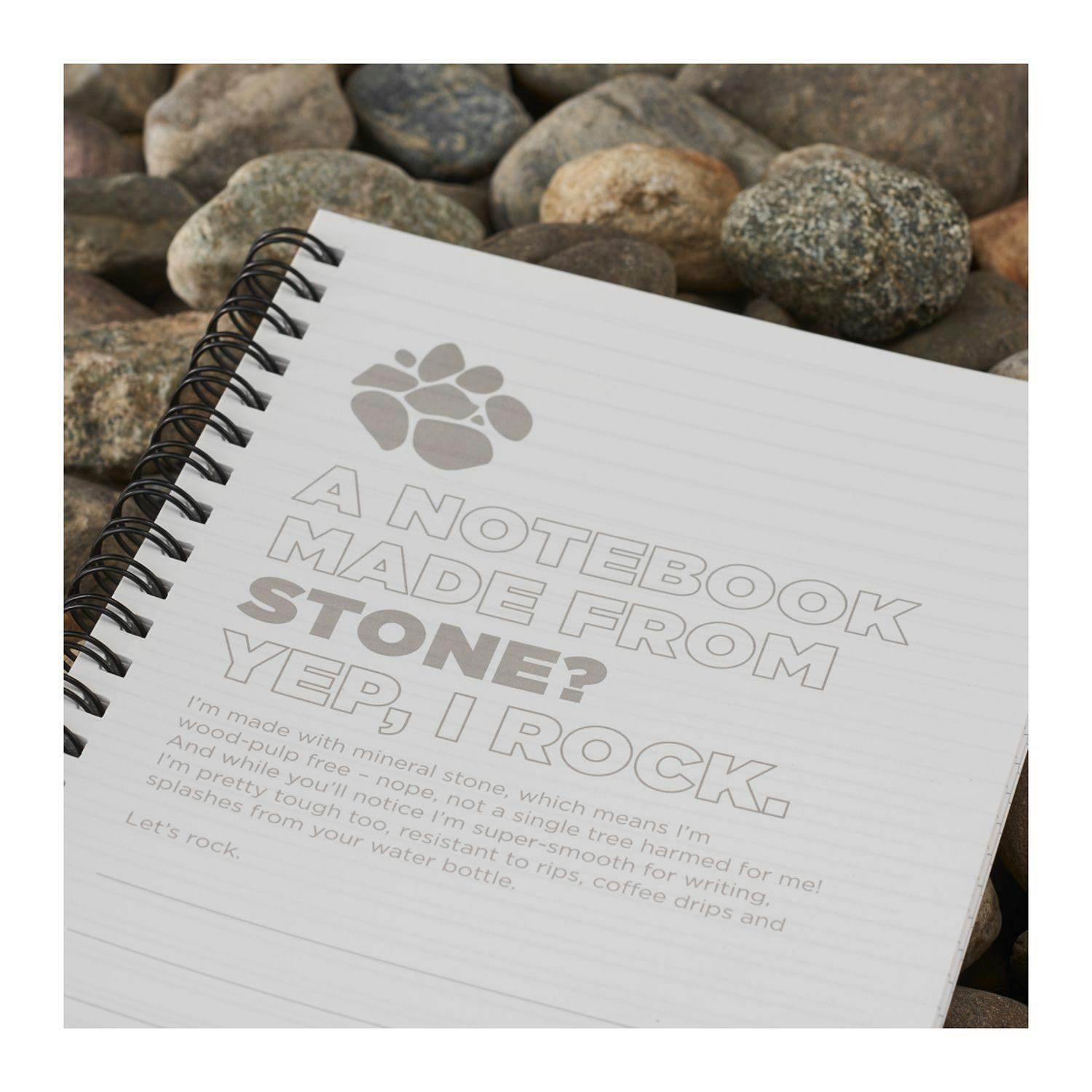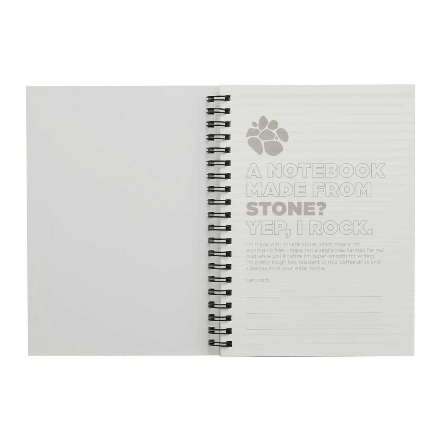 The 5” x 7” Mineral Stone Field Spiral Notebook features a stone paper cover, black wire binding, and 64 sheets of white lined stone paper.