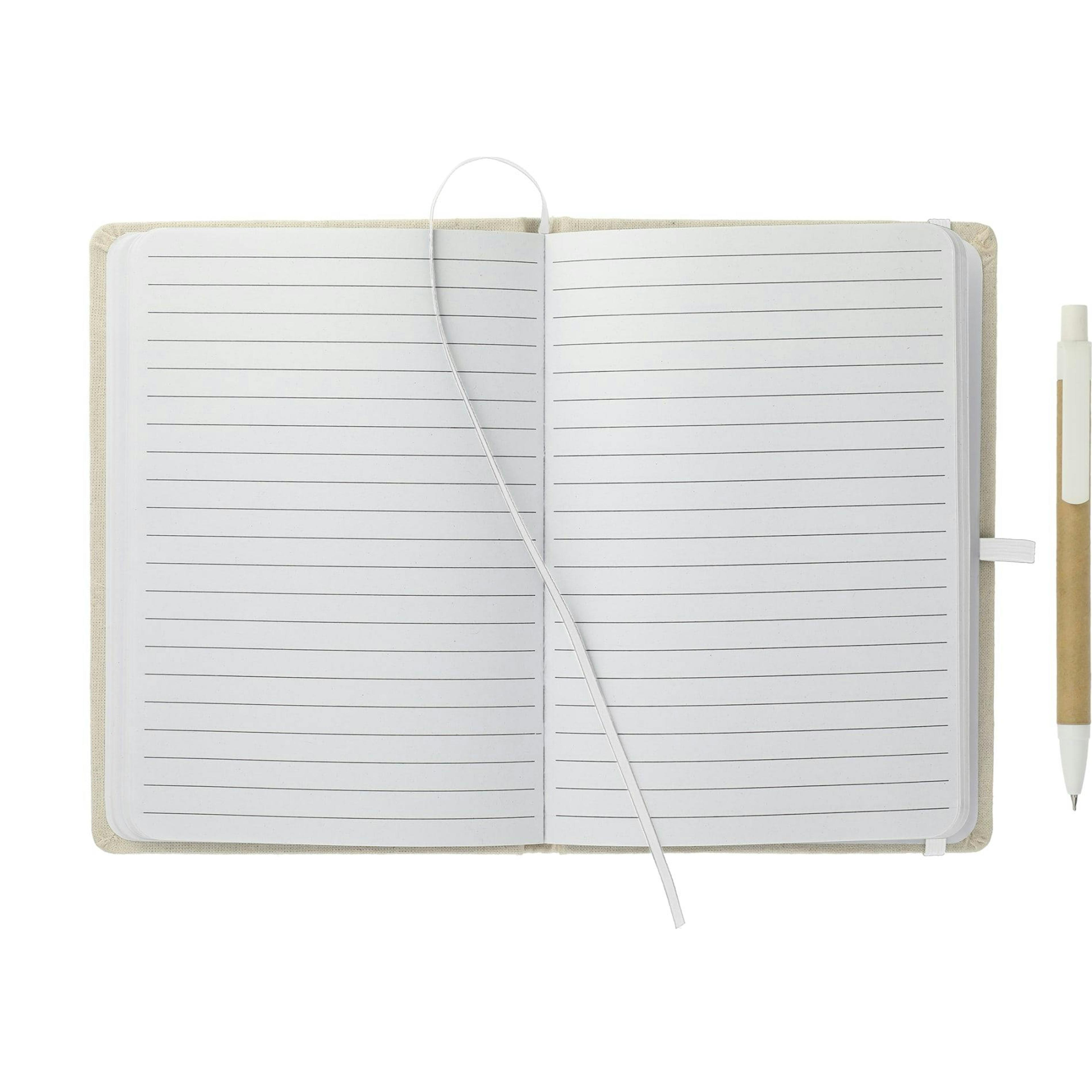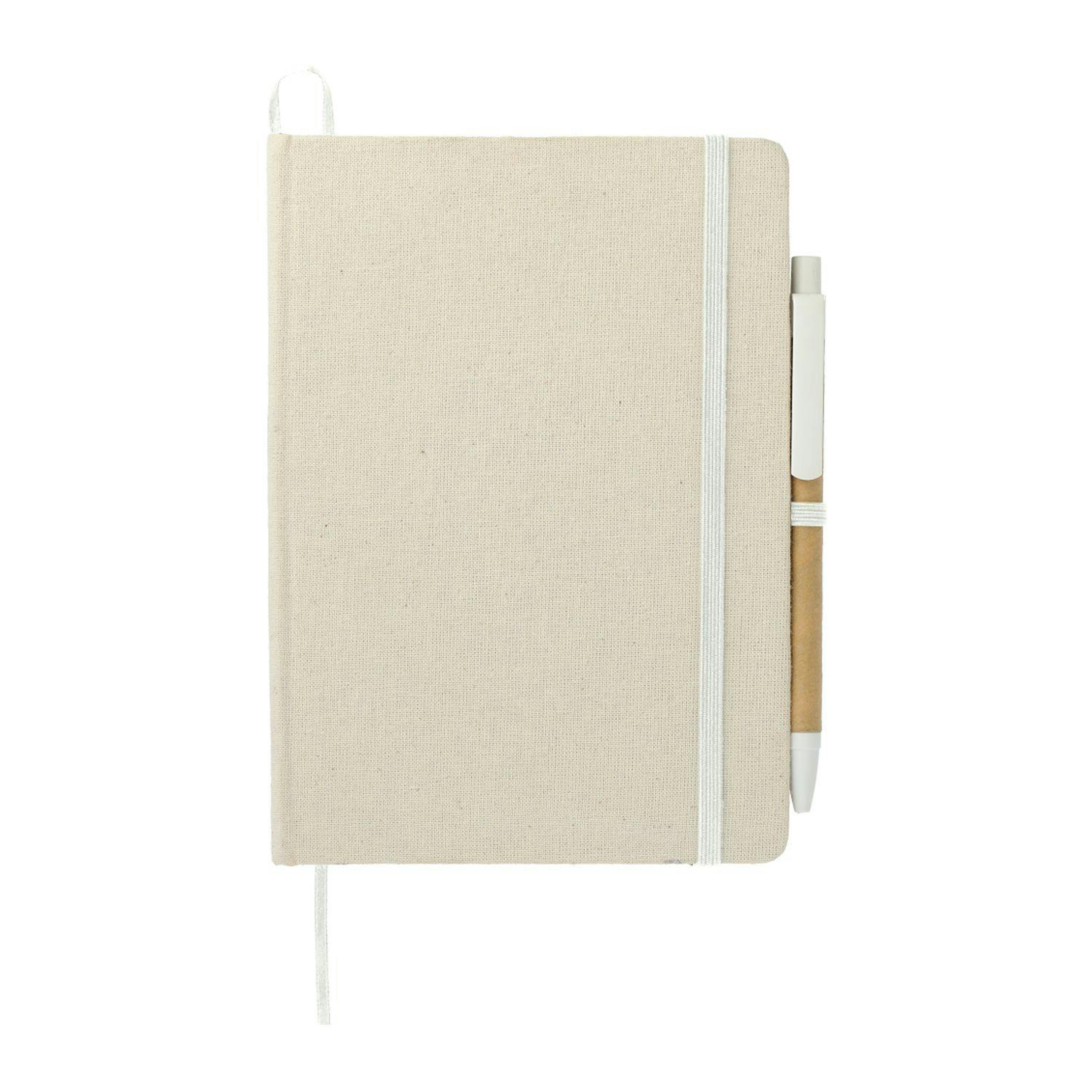 Capture ideas sustainably with this 5" x 7" Organic Cotton Bound Notebook with Pen. Its hard cover is made from 80% recycled organic cotton, giving it a natural look and feel while supporting eco-conscious use. Inside, 60 sheets of cream recycled paper offer a smooth writing experience, kept neatly in place with an elastic closure and marked by a clean white ribbon page marker. A built-in pen loop holds the included recycled-barrel pen with black ink, so you’re always ready to jot down notes. Compact, durable, and responsibly made, it’s the perfect notebook for meetings, travel, and everyday organization.