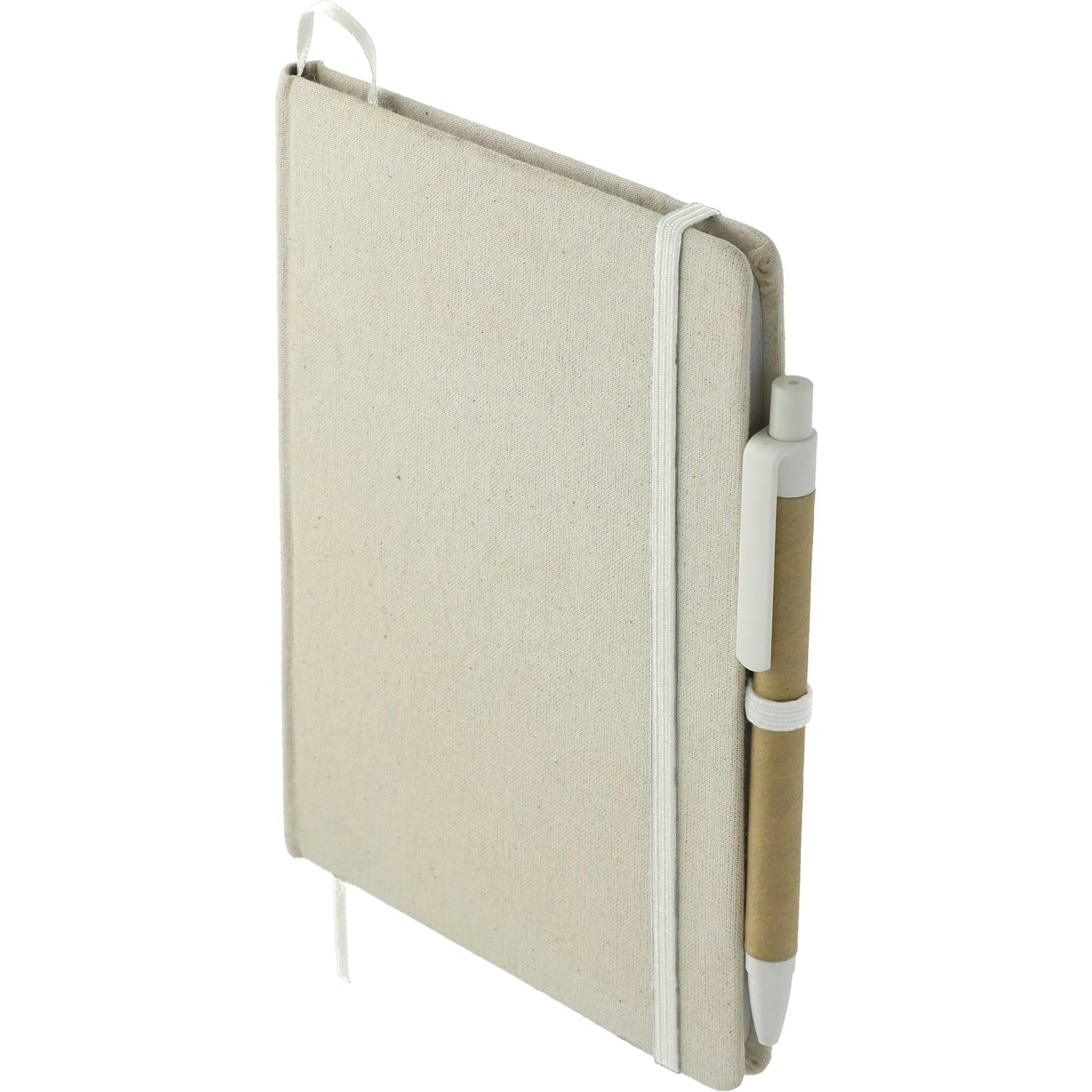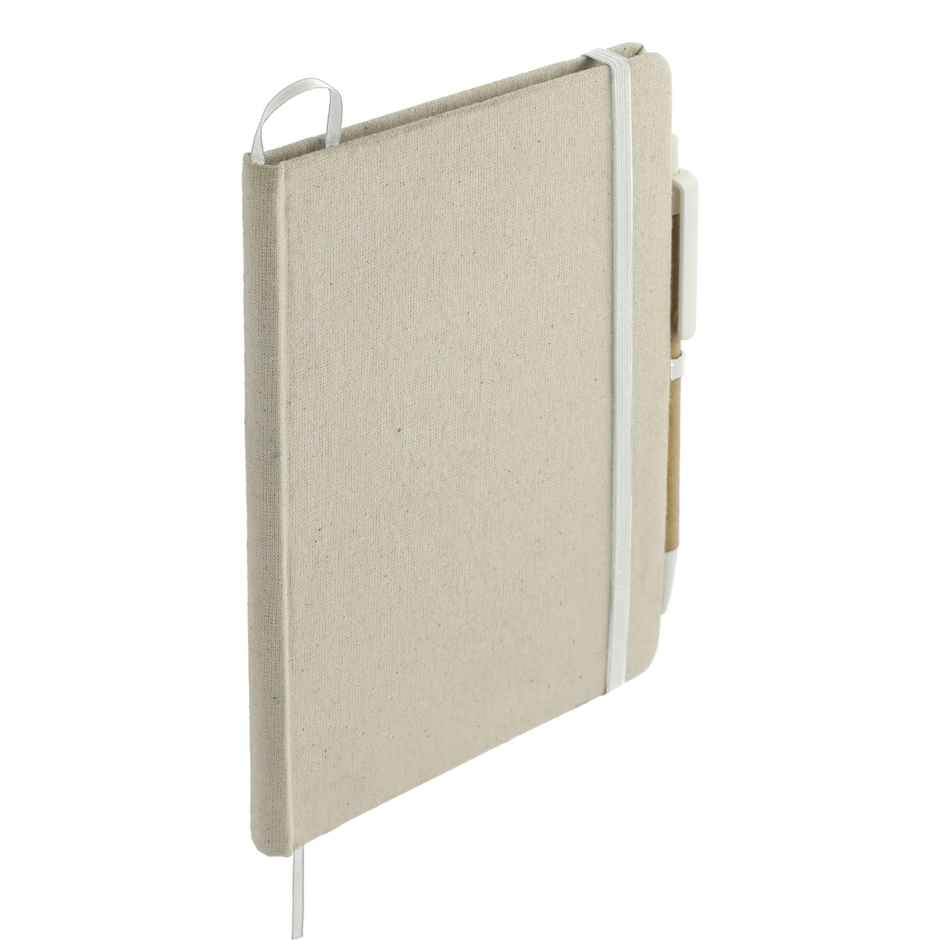The 5" x 7" Organic Cotton Bound Notebook w/Pen features an 80% recycled, organic cotton hard cover with white ribbon page marker, elastic closure, and pen loop. Includes 60 sheets of cream recycled paper. Recycled barrel pen with black ink cartridge.