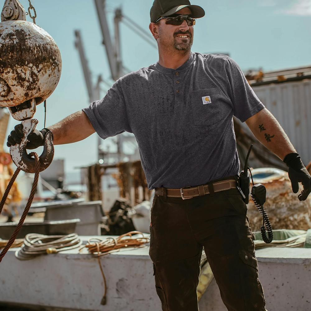 Made from heavyweight 100% cotton jersey, this Carhartt Henley T-Shirt offers durability and all-day comfort. It features a three-button Henley collar, rib knit crewneck, and a convenient left chest pocket with the classic Carhartt label. The tagless neck and side-seam construction help reduce twisting, while the loose fit provides plenty of room to move—making it ideal for tough jobs, team uniforms, or everyday wear.