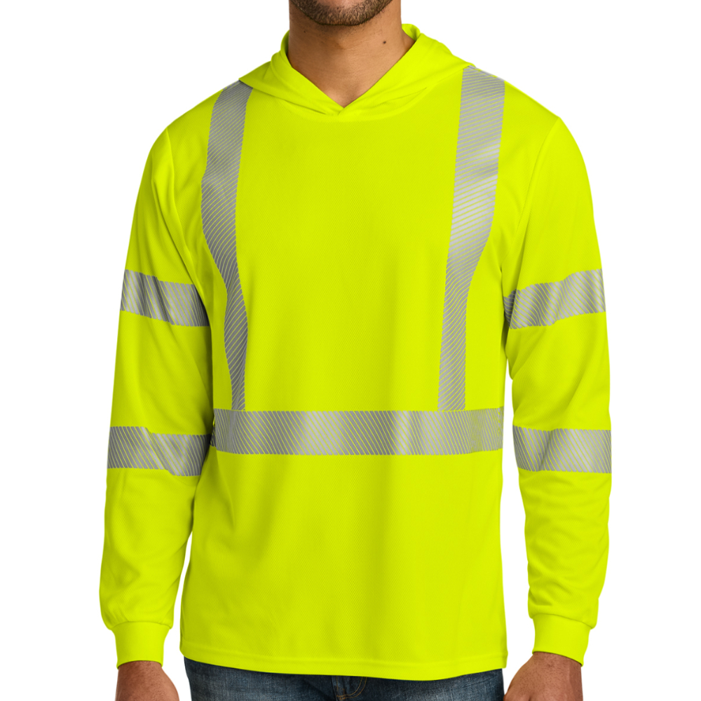 Stay visible, protected, and comfortable on the job with the CornerStone ANSI 107 Class 3 Hooded Tee—designed for high-performance safety in demanding environments. Made from lightweight, breathable birdseye mesh, it keeps you cool while providing UPF 30 sun protection for outdoor work. Segmented reflective tape delivers 360-degree ANSI Class 3 visibility without restricting movement, while the helmet-compatible hood adds extra coverage when you need it. Built for safety, mobility, and all-day wear, this high-visibility tee is ideal for construction, road work, and industrial job sites.
