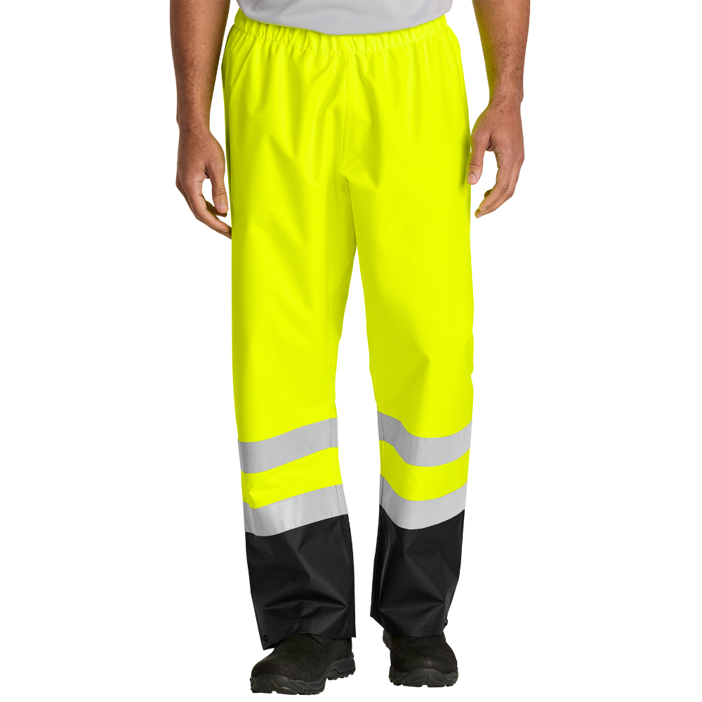 Stay dry, visible, and job-ready in the CornerStone ANSI Class E Pull-On Rain Pant—built for wet conditions and high-visibility safety. Made from water-resistant polyester with fully sealed seams, these rain pants provide dependable protection against rain and harsh weather. Designed for comfort and functionality, the elastic waistband with drawcord ensures a secure fit, while adjustable leg openings make it easy to layer over work boots. Reflective tape delivers 360-degree visibility, and the black lower leg panels help maintain a clean, professional look—perfect for construction, road work, and outdoor job sites.