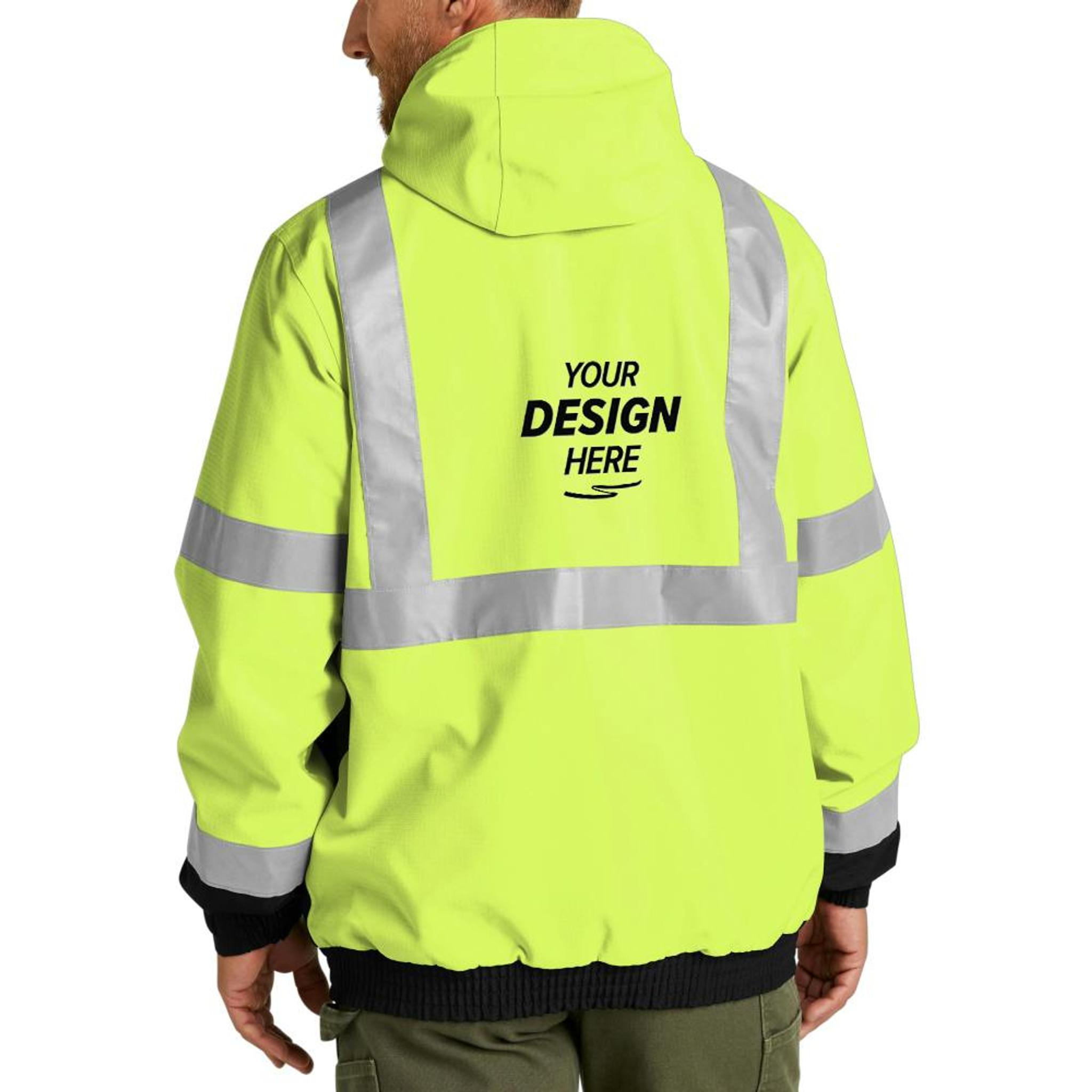 Built for tough conditions and high-visibility job sites, this weather-fighting bomber jacket delivers top-tier protection, durability, and ANSI 107 Class 3 compliance. The 300-denier ripstop shell features a DWR finish for dependable water resistance, paired with fully seam-sealed construction and a 5000MM/5000G/M² waterproof-breathable rating to keep you dry and comfortable. A combination of microfleece and quilted polyfill lining provides targeted warmth, while the insulated, zip-removable rain hood adds adjustable coverage. Reflective 2" tape ensures 360° visibility, and multiple pockets—including a tablet-sized center front pocket—keep gear organized. Finished with mic clips, adjustable cuffs, and a rugged molded zipper, this jacket is built to help you get the job done safely and efficiently.