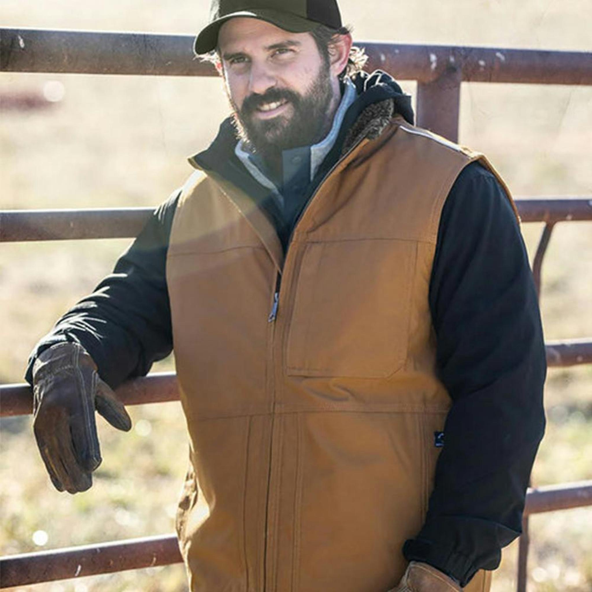 The Dri Duck Rigor GrizzlyTec Vest is built for rugged durability, featuring a polyester GrizzlyTec™ canvas with a robust texture. The upper body is poly sherpa-lined with a rolled sherpa collar edge, providing both warmth and style. With triple-needle stitching for reinforced high-stress seams and reflective trim at the neck, shoulders, and back yoke, this vest ensures durability and visibility. The heavy-duty metal zipper with an easy grab pull, along with internal storm flap, adds to its functionality, and the droptail design and self-fabric hem provide a contemporary look. It also includes zippered secured chest pocket, internal cell phone pocket, and hand pockets with snap closure for added convenience.