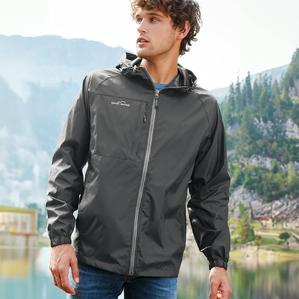 Wind was the inspiration for this Eddie Bauer Packable Wind Jacket compact layer. For convenience, this jacket packs down into its own logo-adorned pocket, making it easy to carry wherever you go. This jacket also features, underarm vents, front zippered pockets, and a hood with drawcords.