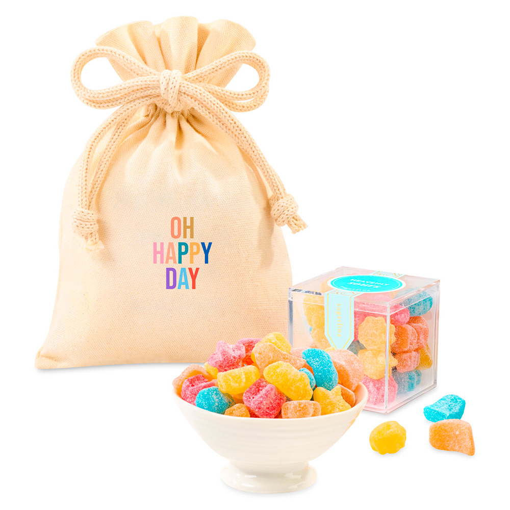 Get ready to pucker up with Sugarfina’s Heavenly Sours Candy Cube Gift Bag, a tangy-sweet treat that’s totally out of this world! Bursting with fruity flavor and shaped like stars, suns, moons, and clouds, these gummies are made with pectin and fruit juice, making them completely vegan-friendly. Packaged in a chic, reusable canvas bag, it’s the perfect gift on its own or paired with a fun keepsake. Made in the USA and crafted with care, this treat is as delightful as it is delicious!