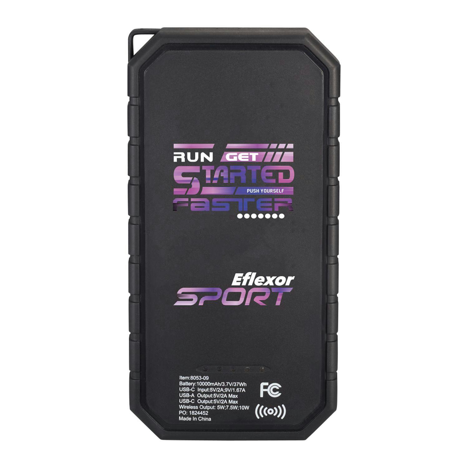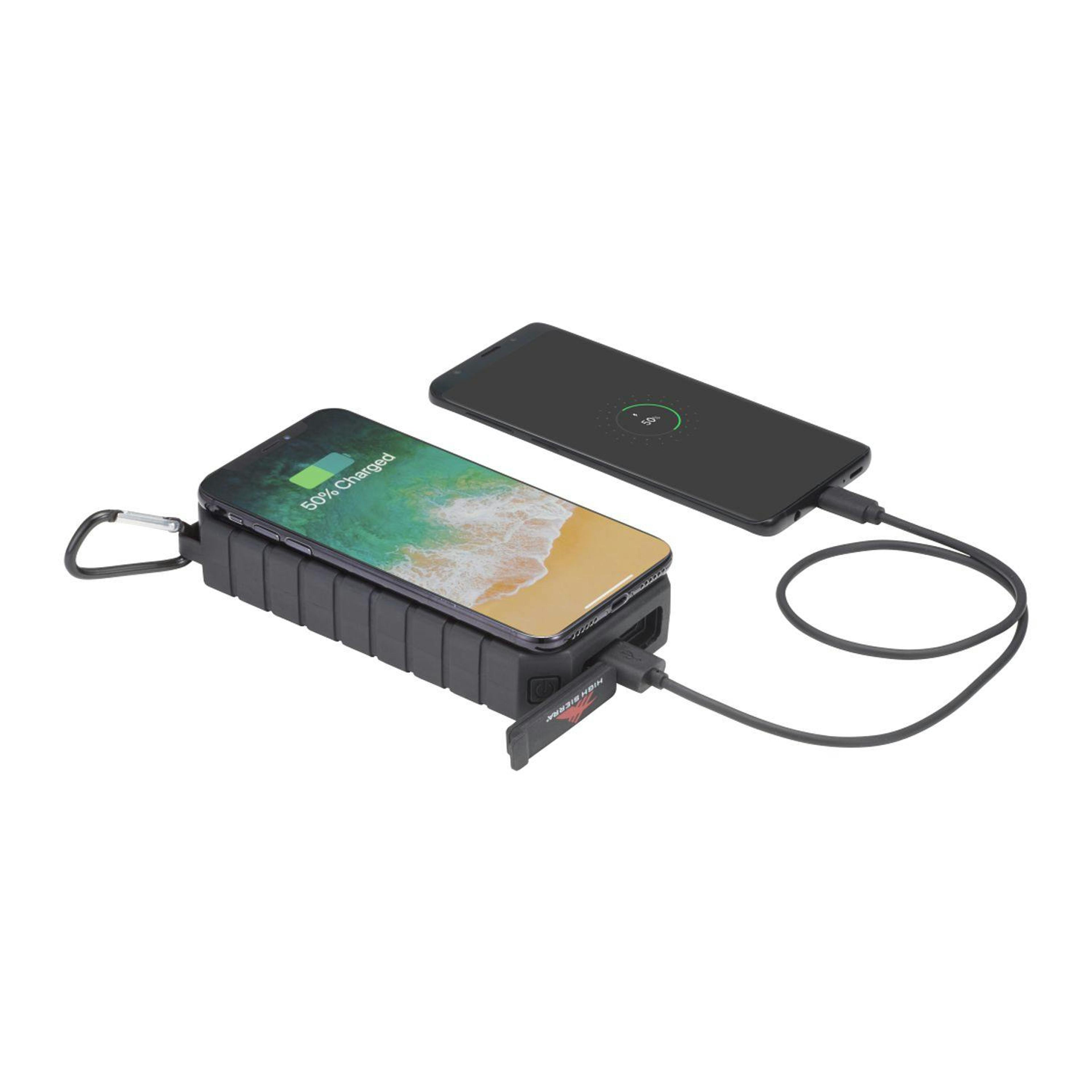 The High Sierra® IPX5 Solar Fast Wireless Power Bank has a 10,000 mAh rechargeable lithium polymer battery (37Wh) that works as a wireless charging pad or normal power bank. It has a solar panel, a built-in flashlight and a carabiner clip for easy carrying. IPX5 Waterproof. USB Output: 5V/2.4A; Type-C Output: 5V/2.4A. Supports three wireless charging modes: 7.5W for All iPhone 8/X/11/12/13 Series; 10W for Samsung Galaxy S9/S9 plus/S8/S8 Plus/Note 9/8 and more, and 5W standard charging for all enabled devices. To charge phones without wireless technology, an external Qi-standard wireless charging receiver or receiver case is required. Wired charging will work with any smartphone or tablet. Works with most plastic phone cases on. Includes a USB-to-Type-C charging cable. Color of solar panel may vary from every batch. Power banks are permitted in carry-on luggage only, and at the discretion of TSA agents. Please charge power bank before initial use.