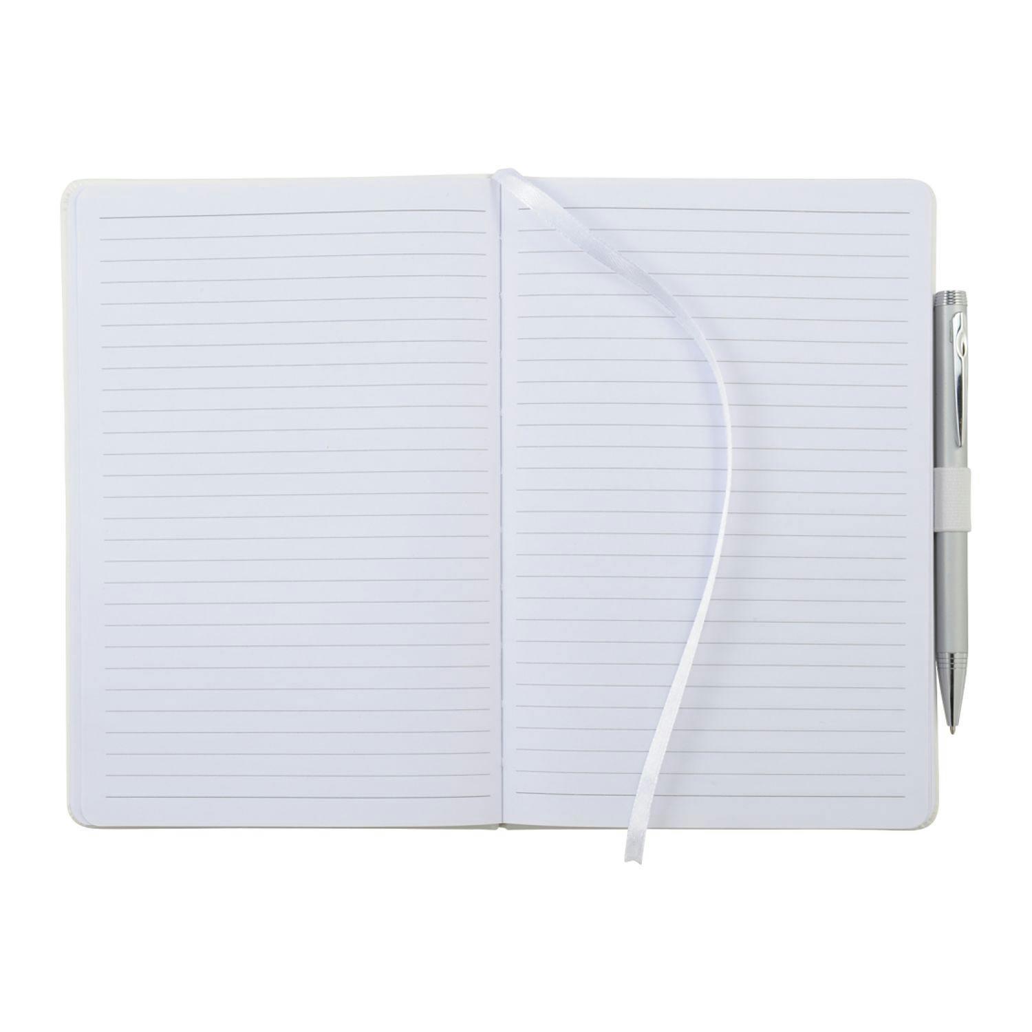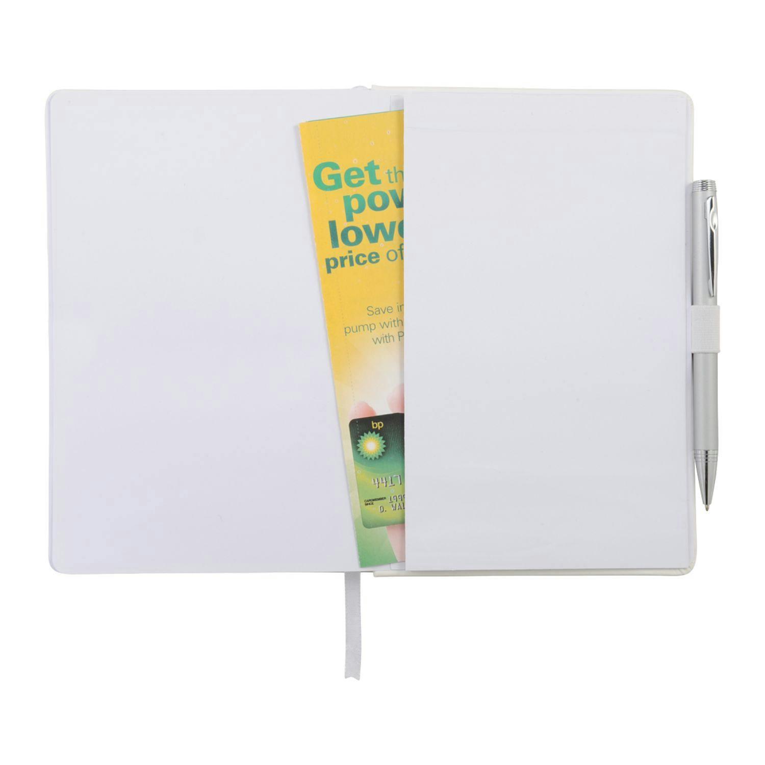 Compact faux-leather hardcover journal (5.5" x 8.5") — durable, professional look with a built-in elastic closure and convenient pen loop. Contains 96 lined white pages, a ribbon page marker and an expandable accordion pocket for receipts, business cards and loose notes. Perfect for meetings, conferences, daily journaling or branded giveaways. Pen not included.