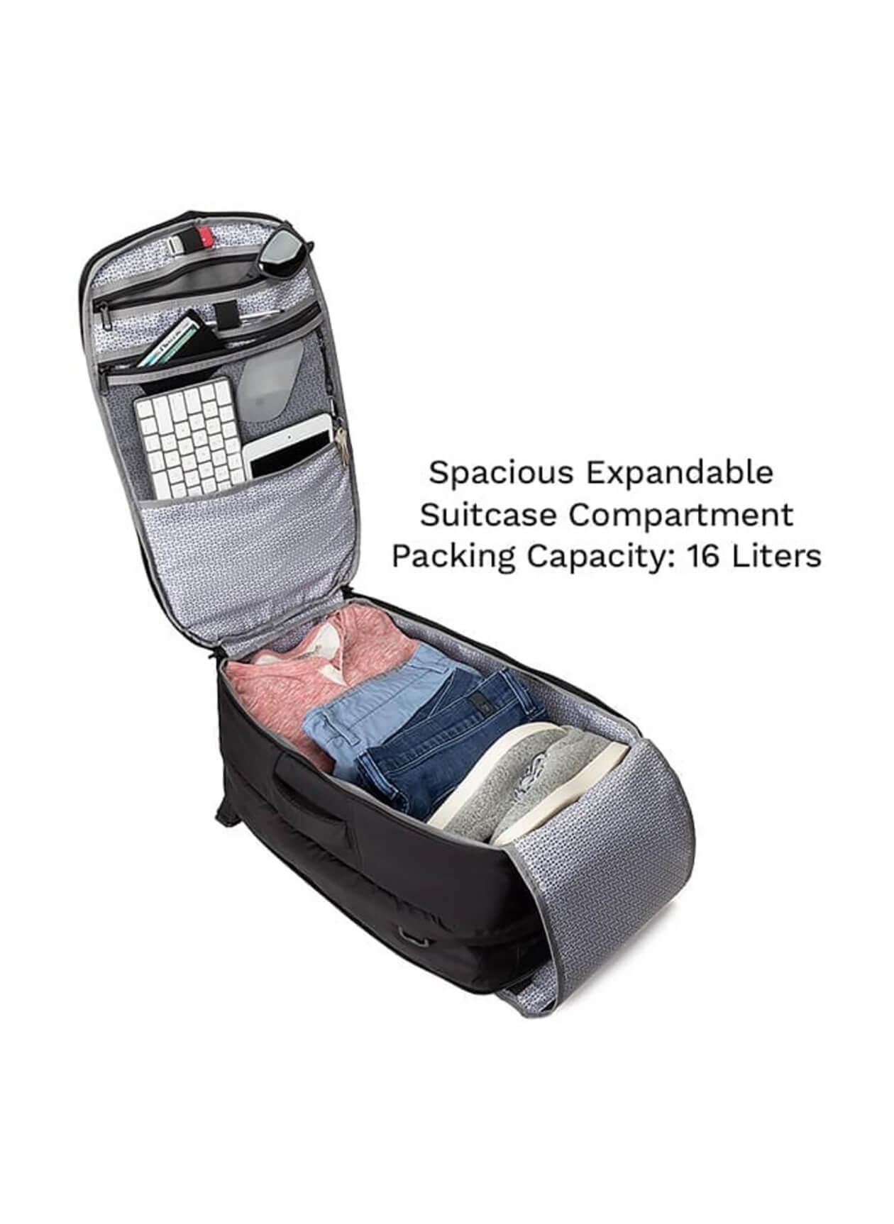 Meet your ultimate travel companion! This bag effortlessly expands from 24L to 40L, holding up to a week’s worth of clothes while staying carry-on friendly and fitting under most seats. With three versatile ways to carry—over the shoulder, backpack, or side handle—and a padded side-zip pocket for your 15" laptop, it’s as adaptable as you are. Add in hidden water bottle storage, lockable zippers, and a compression packing panel with organization pockets, and you’ve got a bag that’s ready for any adventure. Built with lightweight, water-resistant fabric and a comfort-cool memory foam back panel, it’s the perfect blend of style and functionality!